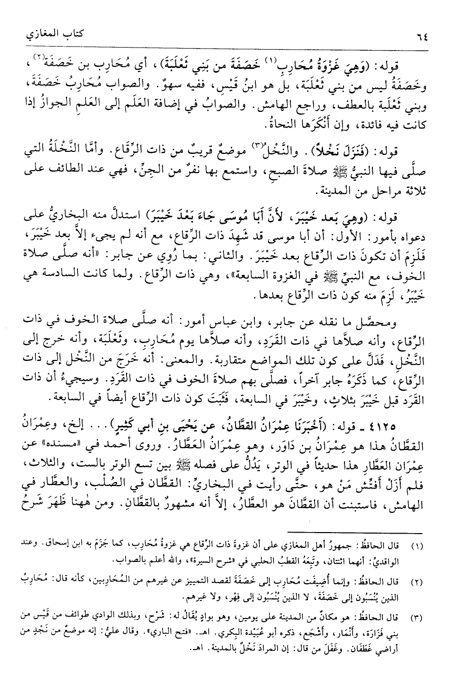 (¬1) قال الحافظُ: جمهورُ أهل المغازي على أن غزوةَ ذات الرِّقاع هي غزوةُ مُحَارِب، كما جَزَمَ به ابن إسحاق. وعند الواقديِّ: أنهما اثنتان، وتَبِعَهُ القطبُ الحلبي في "شرح السيرة"، والله أعلم بالصواب.