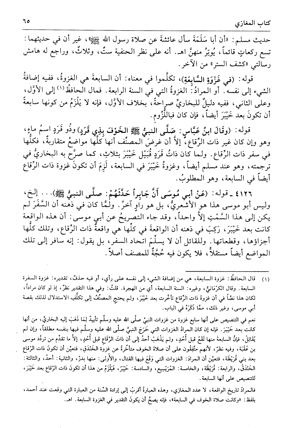 (¬1) قال الحافظُ: غزوة السابعة، هي من إضافة الشيء إلى نفسه على رأي، أو فيه حذفٌ، تقديره: غزوة السفرة السابعة. وقال الكرْمَانيُّ، وغيره: السنة السابعة، أي من الهجرة. قلتُ: وفي هذا التقدير نظرٌ، إذ لو كان مرادًا، لكان هذا نصًّا في أن غزوةَ ذات الرِّقاع تأخَّرت بعد خَيْبَرَ، ولم يحتجِ المصنِّفُ إلى تكلُّفِ الاستدلال لذلك بقصة أبي موسى، وغير ذلك، ممَّا ذَكَرَهُ في الباب.