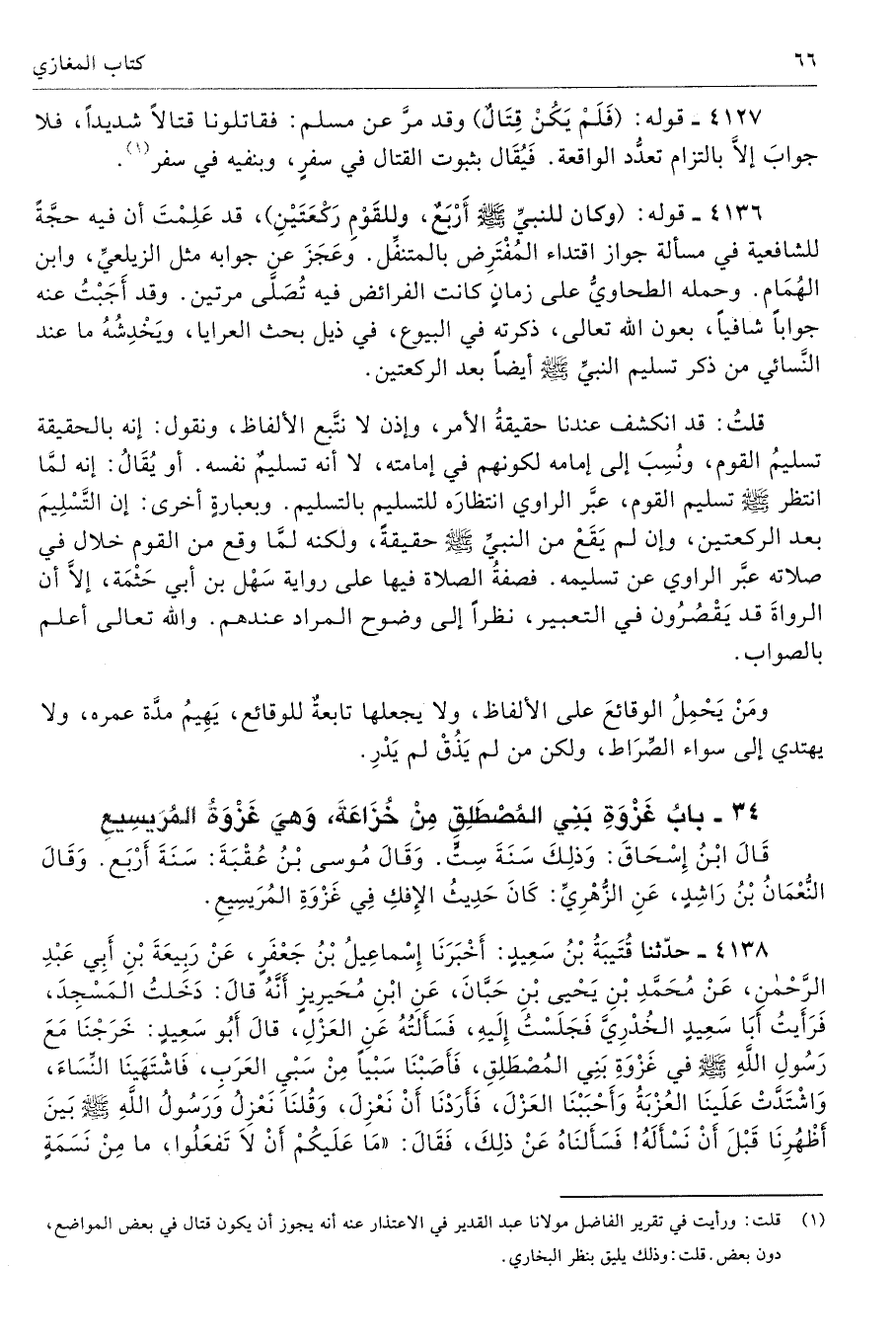 (¬1) قلت: ورأيت في تقرير الفاضل مولانا عبد القدير في الاعتذار عنه أنه يجوز أن يكون قتال في بعض المواضع، دون بعض. قلت: وذلك يليق بنظر البخاري.