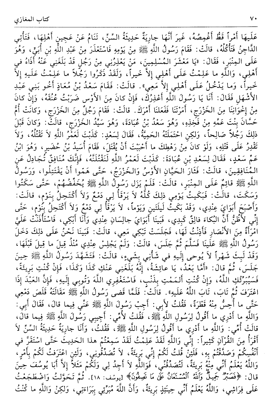 عَلَيْهَا أَمْرًا قَطُّ أَغْمِصُهُ، غَيْرَ أَنَّهَا جَارِيَةٌ حَدِيثَةُ السِّنِّ تَنَامُ عَنْ عَجِينِ أَهْلِهَا، فَتَأْتِى الدَّاجِنُ فَتَأْكُلُهُ - قَالَتْ - فَقَامَ رَسُولُ اللَّهِ - صلى الله عليه وسلم - مِنْ يَوْمِهِ، فَاسْتَعْذَرَ مِنْ عَبْدِ اللَّهِ بْنِ أُبَىٍّ وَهْوَ عَلَى الْمِنْبَرِ فَقَالَ «يَا مَعْشَرَ الْمُسْلِمِينَ مَنْ يَعْذِرُنِى مِنْ رَجُلٍ قَدْ بَلَغَنِى عَنْهُ أَذَاهُ فِى أَهْلِى، وَاللَّهِ مَا عَلِمْتُ عَلَى أَهْلِى إِلاَّ خَيْرًا، وَلَقَدْ ذَكَرُوا رَجُلاً مَا عَلِمْتُ عَلَيْهِ إِلاَّ خَيْرًا، وَمَا يَدْخُلُ عَلَى أَهْلِى إِلاَّ مَعِى». قَالَتْ فَقَامَ سَعْدُ بْنُ مُعَاذٍ أَخُو بَنِى عَبْدِ الأَشْهَلِ فَقَالَ أَنَا يَا رَسُولَ اللَّهِ أَعْذِرُكَ، فَإِنْ كَانَ مِنَ الأَوْسِ ضَرَبْتُ عُنُقَهُ، وَإِنْ كَانَ مِنْ إِخْوَانِنَا مِنَ الْخَزْرَجِ أَمَرْتَنَا فَفَعَلْنَا أَمْرَكَ. قَالَتْ فَقَامَ رَجُلٌ مِنَ الْخَزْرَجِ، وَكَانَتْ أُمُّ حَسَّانَ بِنْتَ عَمِّهِ مِنْ فَخِذِهِ، وَهْوَ سَعْدُ بْنُ عُبَادَةَ، وَهْوَ سَيِّدُ الْخَزْرَجِ - قَالَتْ - وَكَانَ قَبْلَ ذَلِكَ رَجُلاً صَالِحًا، وَلَكِنِ احْتَمَلَتْهُ الْحَمِيَّةُ فَقَالَ لِسَعْدٍ كَذَبْتَ لَعَمْرُ اللَّهِ لاَ تَقْتُلُهُ، وَلاَ تَقْدِرُ عَلَى قَتْلِهِ، وَلَوْ كَانَ مِنْ رَهْطِكَ مَا أَحْبَبْتَ أَنْ يُقْتَلَ. فَقَامَ أُسَيْدُ بْنُ حُضَيْرٍ - وَهْوَ ابْنُ عَمِّ سَعْدٍ - فَقَالَ لِسَعْدِ بْنِ عُبَادَةَ كَذَبْتَ لَعَمْرُ اللَّهِ لَنَقْتُلَنَّهُ، فَإِنَّكَ مُنَافِقٌ تُجَادِلُ عَنِ الْمُنَافِقِينَ. قَالَتْ فَثَارَ الْحَيَّانِ الأَوْسُ وَالْخَزْرَجُ حَتَّى هَمُّوا أَنْ يَقْتَتِلُوا، وَرَسُولُ اللَّهِ - صلى الله عليه وسلم - قَائِمٌ عَلَى الْمِنْبَرِ - قَالَتْ - فَلَمْ يَزَلْ رَسُولُ اللَّهِ - صلى الله عليه وسلم - يُخَفِّضُهُمْ حَتَّى سَكَتُوا وَسَكَتَ - قَالَتْ - فَبَكَيْتُ يَوْمِى ذَلِكَ كُلَّهُ، لاَ يَرْقَأُ لِى دَمْعٌ، وَلاَ أَكْتَحِلُ بِنَوْمٍ - قَالَتْ - وَأَصْبَحَ أَبَوَاىَ عِنْدِى، وَقَدْ بَكَيْتُ لَيْلَتَيْنِ وَيَوْمًا، لاَ يَرْقَأُ لِى دَمْعٌ، وَلاَ أَكْتَحِلُ بِنَوْمٍ، حَتَّى إِنِّى لأَظُنُّ أَنَّ الْبُكَاءَ فَالِقٌ كَبِدِى، فَبَيْنَا أَبَوَاىَ جَالِسَانِ عِنْدِى وَأَنَا أَبْكِى فَاسْتَأْذَنَتْ عَلَىَّ امْرَأَةٌ مِنَ الأَنْصَارِ، فَأَذِنْتُ لَهَا، فَجَلَسَتْ تَبْكِى مَعِى - قَالَتْ - فَبَيْنَا نَحْنُ عَلَى ذَلِكَ دَخَلَ رَسُولُ اللَّهِ - صلى الله عليه وسلم - عَلَيْنَا، فَسَلَّمَ ثُمَّ جَلَسَ - قَالَتْ - وَلَمْ يَجْلِسْ عِنْدِى مُنْذُ قِيلَ مَا قِيلَ قَبْلَهَا، وَقَدْ لَبِثَ شَهْرًا لاَ يُوحَى إِلَيْهِ فِى شَأْنِى بِشَىْءٍ - قَالَتْ - فَتَشَهَّدَ رَسُولُ اللَّهِ - صلى الله عليه وسلم - حِينَ جَلَسَ ثُمَّ قَالَ «أَمَّا بَعْدُ، يَا عَائِشَةُ إِنَّهُ بَلَغَنِى عَنْكِ كَذَا وَكَذَا، فَإِنْ كُنْتِ بَرِيئَةً، فَسَيُبَرِّئُكِ اللَّهُ، وَإِنْ كُنْتِ أَلْمَمْتِ بِذَنْبٍ، فَاسْتَغْفِرِى اللَّهَ وَتُوبِى إِلَيْهِ، فَإِنَّ الْعَبْدَ إِذَا اعْتَرَفَ ثُمَّ تَابَ تَابَ اللَّهُ عَلَيْهِ». قَالَتْ فَلَمَّا قَضَى رَسُولُ اللَّهِ - صلى الله عليه وسلم - مَقَالَتَهُ قَلَصَ دَمْعِى حَتَّى مَا أُحِسُّ مِنْهُ قَطْرَةً، فَقُلْتُ لأَبِى أَجِبْ رَسُولَ اللَّهِ - صلى الله عليه وسلم - عَنِّى فِيمَا قَالَ. فَقَالَ أَبِى وَاللَّهِ مَا أَدْرِى مَا أَقُولُ لِرَسُولِ اللَّهِ - صلى الله عليه وسلم -. فَقُلْتُ لأُمِّى أَجِيبِى رَسُولَ اللَّهِ - صلى الله عليه وسلم - فِيمَا قَالَ. قَالَتْ أُمِّى وَاللَّهِ مَا أَدْرِى مَا أَقُولُ لِرَسُولِ اللَّهِ - صلى الله عليه وسلم -. فَقُلْتُ وَأَنَا جَارِيَةٌ حَدِيثَةُ السِّنِّ لاَ أَقْرَأُ مِنَ الْقُرْآنِ كَثِيرًا إِنِّى 