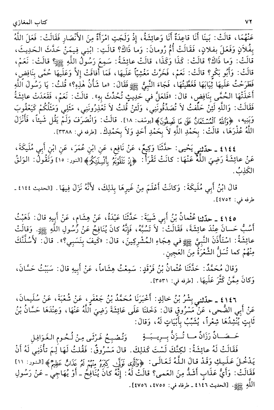 وَقَالَ مُحَمَّدٌ حَدَّثَنَا عُثْمَانُ بْنُ فَرْقَدٍ سَمِعْتُ هِشَامًا عَنْ أَبِيهِ قَالَ سَبَبْتُ حَسَّانَ، وَكَانَ مِمَّنْ كَثَّرَ عَلَيْهَا. تحفة 17100