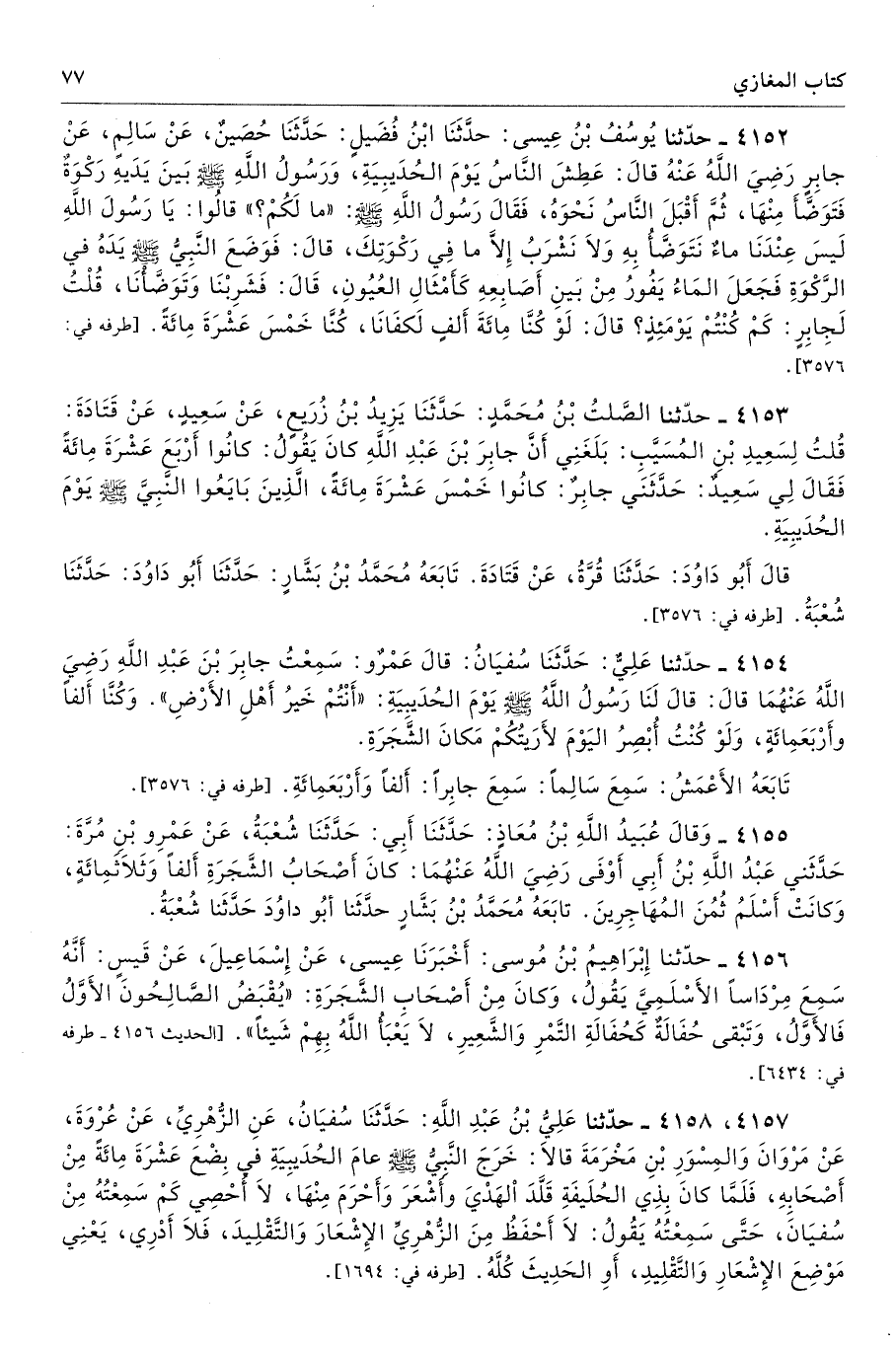 4152 - حَدَّثَنَا يُوسُفُ بْنُ عِيسَى حَدَّثَنَا ابْنُ فُضَيْلٍ حَدَّثَنَا حُصَيْنٌ عَنْ سَالِمٍ عَنْ جَابِرٍ - رضى الله عنه - قَالَ عَطِشَ النَّاسُ يَوْمَ الْحُدَيْبِيَةِ وَرَسُولُ اللَّهِ - صلى الله عليه وسلم - بَيْنَ يَدَيْهِ رَكْوَةٌ، فَتَوَضَّأَ مِنْهَا، ثُمَّ أَقْبَلَ النَّاسُ نَحْوَهُ فَقَالَ رَسُولُ اللَّهِ - صلى الله عليه وسلم - «مَا لَكُمْ». قَالُوا يَا رَسُولَ اللَّهِ لَيْسَ عِنْدَنَا مَاءٌ نَتَوَضَّأُ بِهِ، وَلاَ نَشْرَبُ إِلَّا مَا فِى رَكْوَتِكَ. قَالَ فَوَضَعَ النَّبِىُّ - صلى الله عليه وسلم - يَدَهُ فِى الرَّكْوَةِ، فَجَعَلَ الْمَاءُ يَفُورُ مِنْ بَيْنِ أَصَابِعِهِ كَأَمْثَالِ الْعُيُونِ، قَالَ فَشَرِبْنَا وَتَوَضَّأْنَا. فَقُلْتُ لِجَابِرٍ كَمْ كُنْتُمْ يَوْمَئِذٍ قَالَ لَوْ كُنَّا مِائَةَ أَلْفٍ لَكَفَانَا، كُنَّا خَمْسَ عَشْرَةَ مِائَةً. أطرافه 3576، 4153، 4154، 4840، 5639 - تحفة 2242 - 157/ 5