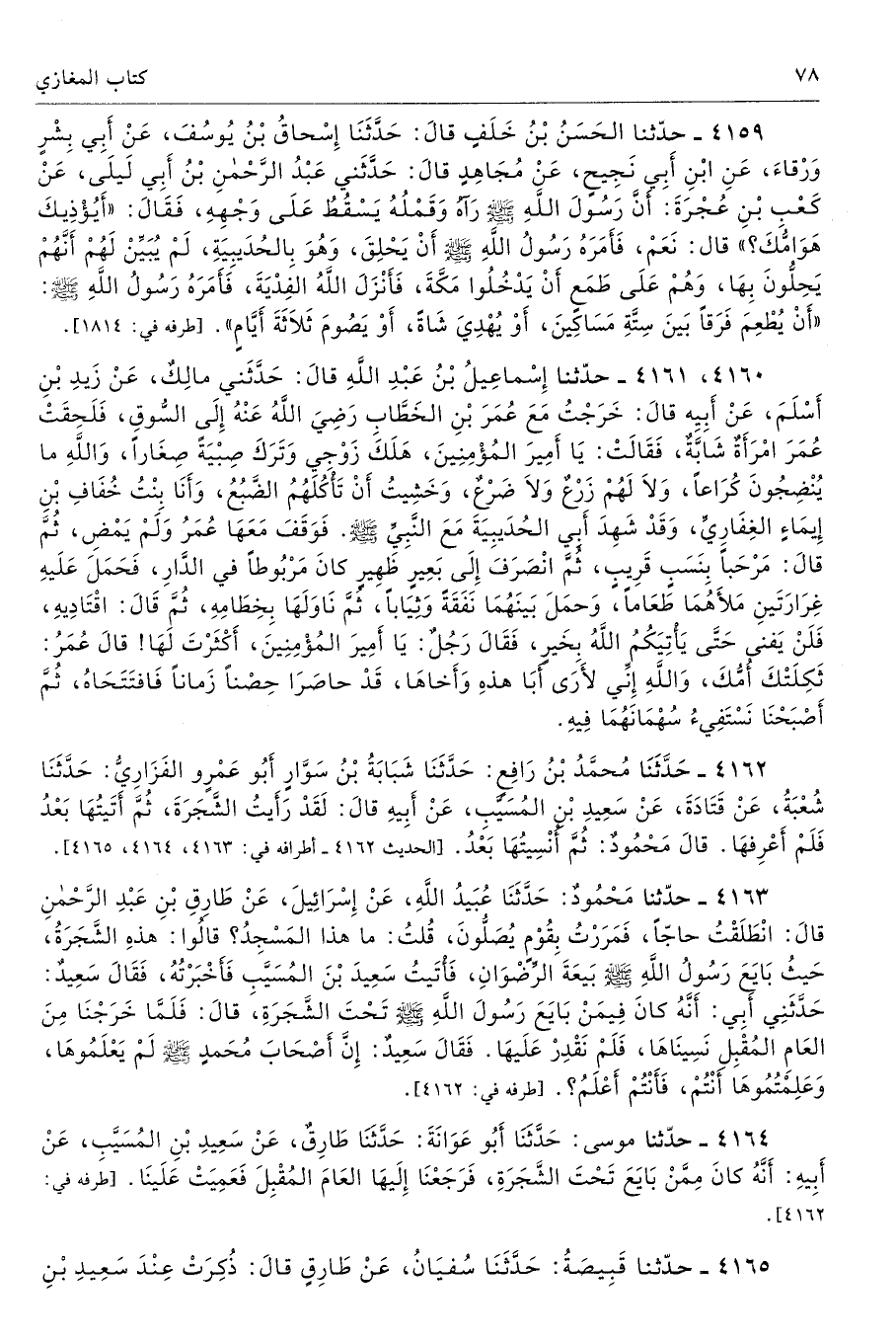 4164 - حَدَّثَنَا مُوسَى حَدَّثَنَا أَبُو عَوَانَةَ حَدَّثَنَا طَارِقٌ عَنْ سَعِيدِ بْنِ الْمُسَيَّبِ عَنْ أَبِيهِ أَنَّهُ كَانَ مِمَّنْ بَايَعَ تَحْتَ الشَّجَرَةِ، فَرَجَعْنَا إِلَيْهَا الْعَامَ الْمُقْبِلَ فَعَمِيَتْ عَلَيْنَا. أطرافه 4162، 4163، 4165 - تحفة 11282