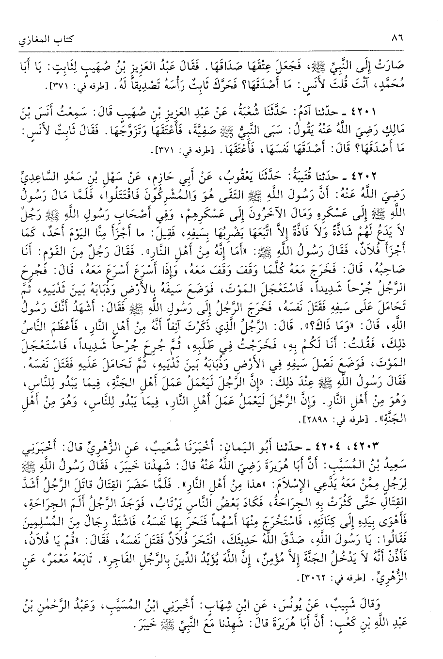 4201 - حَدَّثَنَا آدَمُ حَدَّثَنَا شُعْبَةُ عَنْ عَبْدِ الْعَزِيزِ بْنِ صُهَيْبٍ قَالَ سَمِعْتُ أَنَسَ بْنَ مَالِكٍ - رضى الله عنه - يَقُولُ سَبَى النَّبِىُّ - صلى الله عليه وسلم - صَفِيَّةَ، فَأَعْتَقَهَا وَتَزَوَّجَهَا. فَقَالَ ثَابِتٌ لأَنَسٍ مَا أَصْدَقَهَا قَالَ أَصْدَقَهَا نَفْسَهَا فَأَعْتَقَهَا. أطرافه 371، 610، 947، 2228، 2235، 2889، 2893، 2943، 2944، 2945، 2991، 3085، 3086، 3367، 3647، 4083، 4084، 4197، 4198، 4199، 4200، 4211، 4212، 4213، 5085، 5159، 5169، 5387، 5425، 5528، 5968، 6185، 6363، 6369، 7333 - تحفة 1029