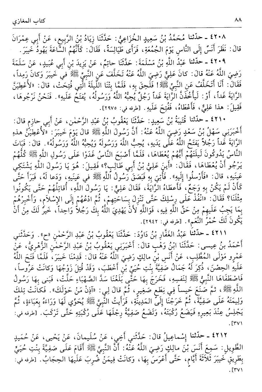 4212 - حَدَّثَنَا إِسْمَاعِيلُ قَالَ حَدَّثَنِى أَخِى عَنْ سُلَيْمَانَ عَنْ يَحْيَى عَنْ حُمَيْدٍ الطَّوِيلِ سَمِعَ أَنَسَ بْنَ مَالِكٍ - رضى الله عنه أَنَّ النَّبِىَّ - صلى الله عليه وسلم - أَقَامَ عَلَى صَفِيَّةَ بِنْتِ حُيَىٍّ، بِطَرِيقِ خَيْبَرَ ثَلاَثَةَ أَيَّامٍ، حَتَّى أَعْرَسَ بِهَا، وَكَانَتْ فِيمَنْ ضُرِبَ عَلَيْهَا الْحِجَابُ. أطرافه 371، 610، 947، 2228، 2235، 2889، 2893، 2943، 2944، 2945، 2991، 3085، 3086، 3367، 3647، 4083، 4084، 4197، 4198، 4199، 4200، 4201، 4211، 4213، 5085، 5159، 5169، 5387، 5425، 5528، 5968، 6185، 6363، 6369، 7333 - تحفة 796