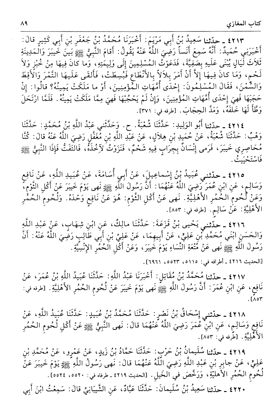 4213 - حَدَّثَنَا سَعِيدُ بْنُ أَبِى مَرْيَمَ أَخْبَرَنَا مُحَمَّدُ بْنُ جَعْفَرِ بْنِ أَبِى كَثِيرٍ قَالَ أَخْبَرَنِى حُمَيْدٌ أَنَّهُ سَمِعَ أَنَسًا - رضى الله عنه - يَقُولُ أَقَامَ النَّبِىُّ - صلى الله عليه وسلم - بَيْنَ خَيْبَرَ وَالْمَدِينَةِ ثَلاَثَ لَيَالٍ يُبْنَى عَلَيْهِ بِصَفِيَّةَ، فَدَعَوْتُ الْمُسْلِمِينَ إِلَى وَلِيمَتِهِ، وَمَا كَانَ فِيهَا مِنْ خُبْزٍ وَلاَ لَحْمٍ، وَمَا كَانَ فِيهَا إِلاَّ أَنْ أَمَرَ بِلاَلاً بِالأَنْطَاعِ فَبُسِطَتْ، فَأَلْقَى عَلَيْهَا التَّمْرَ وَالأَقِطَ وَالسَّمْنَ، فَقَالَ الْمُسْلِمُونَ إِحْدَى أُمَّهَاتِ الْمُؤْمِنِينَ، أَوْ مَا مَلَكَتْ يَمِينُهُ قَالُوا إِنْ حَجَبَهَا فَهْىَ إِحْدَى أُمَّهَاتِ الْمُؤْمِنِينَ، وَإِنْ لَمْ يَحْجُبْهَا فَهْىَ مِمَّا مَلَكَتْ يَمِينُهُ. فَلَمَّا ارْتَحَلَ وَطَّأَ لَهَا خَلْفَهُ، وَمَدَّ الْحِجَابَ. أطرافه 371، 610، 947، 2228، 2235، 2889، 2893، 2942، 2944، 2945، 2991، 3085، 3086، 3367، 3647، 4083، 4084، 4197، 4198، 4199، 4200، 4201، 4211، 4212، 5085، 5159، 5169، 5387، 5425، 5528، 5968، 6185، 6363، 6369، 7333 - تحفة 746