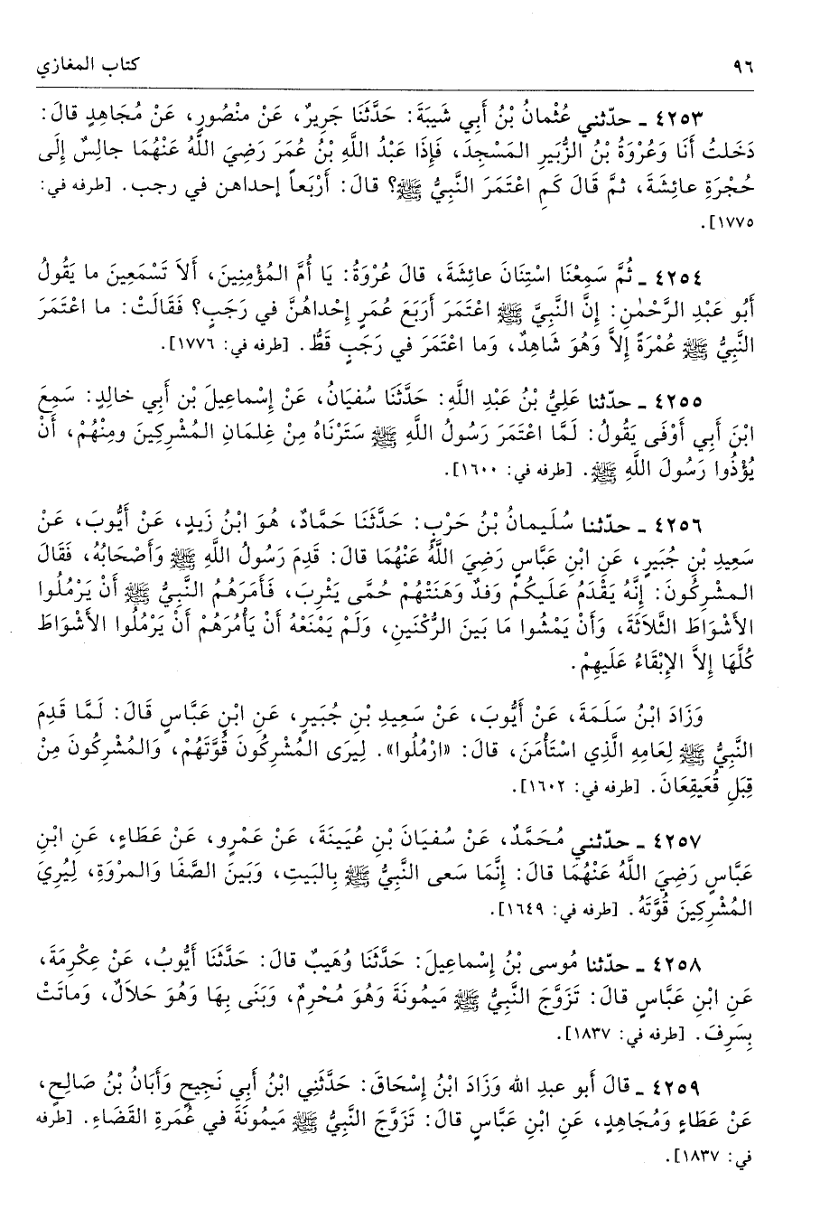 4253 - حَدَّثَنِى عُثْمَانُ بْنُ أَبِى شَيْبَةَ حَدَّثَنَا جَرِيرٌ عَنْ مَنْصُورٍ عَنْ مُجَاهِدٍ قَالَ دَخَلْتُ أَنَا وَعُرْوَةُ بْنُ الزُّبَيْرِ الْمَسْجِدَ فَإِذَا عَبْدُ اللَّهِ بْنُ عُمَرَ - رضى الله عنهما - جَالِسٌ إِلَى حُجْرَةِ عَائِشَةَ ثُمَّ قَالَ كَمِ اعْتَمَرَ النَّبِىُّ - صلى الله عليه وسلم - قَالَ أَرْبَعًا {إِحْدَاهُنَّ فِى رَجَبٍ}. طرفه 1775 تحفة 7384 - 181/ 5