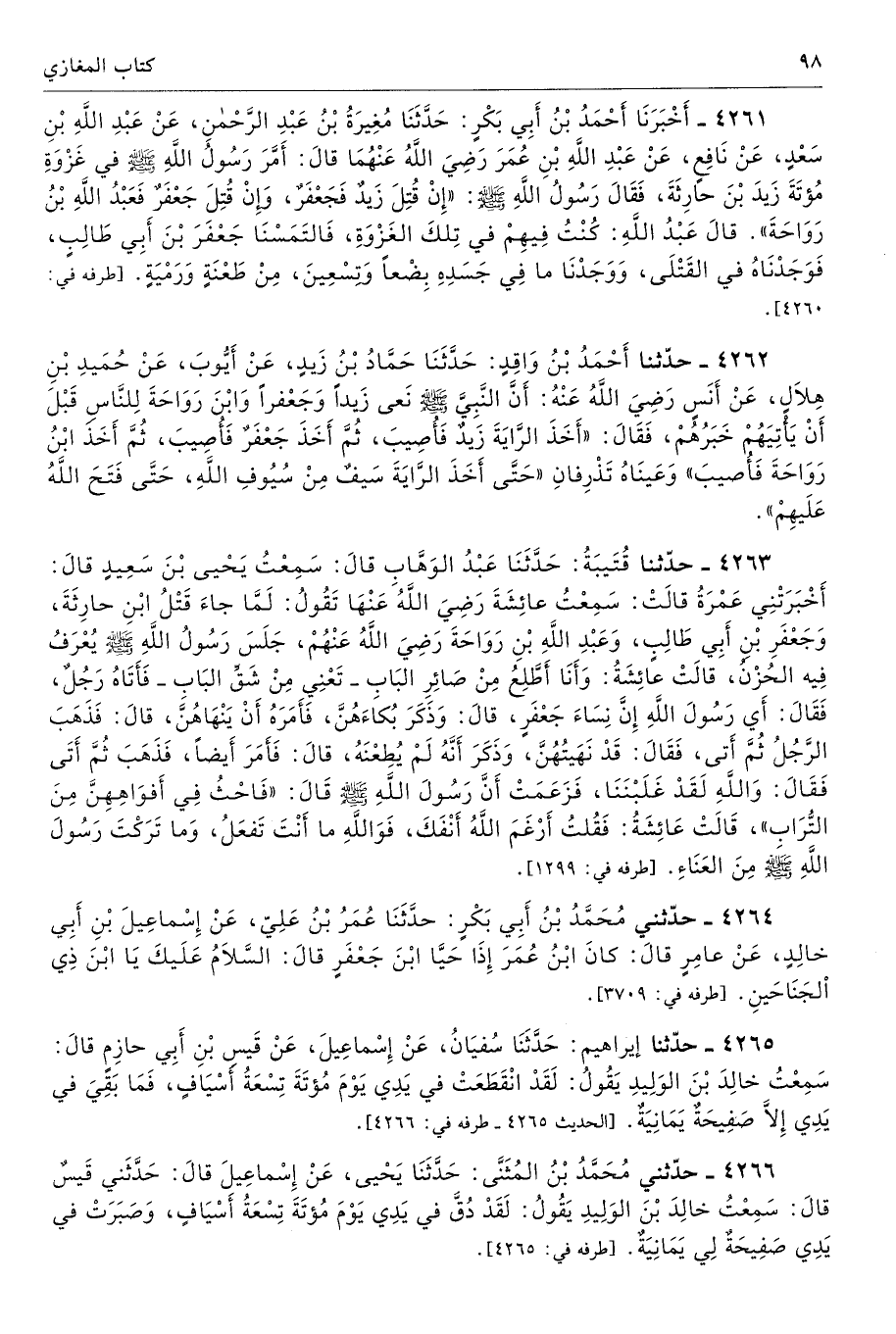 4262 - حَدَّثَنَا أَحْمَدُ بْنُ وَاقِدٍ حَدَّثَنَا حَمَّادُ بْنُ زَيْدٍ عَنْ أَيُّوبَ عَنْ حُمَيْدِ بْنِ هِلاَلٍ عَنْ أَنَسٍ - رضى الله عنه - أَنَّ النَّبِىَّ - صلى الله عليه وسلم - نَعَى زَيْدًا وَجَعْفَرًا وَابْنَ رَوَاحَةَ لِلنَّاسِ، قَبْلَ أَنْ يَأْتِيَهُمْ خَبَرُهُمْ فَقَالَ «أَخَذَ الرَّايَةَ زَيْدٌ فَأُصِيبَ، ثُمَّ أَخَذَ جَعْفَرٌ فَأُصِيبَ، ثُمَّ أَخَذَ ابْنُ رَوَاحَةَ فَأُصِيبَ - وَعَيْنَاهُ تَذْرِفَانِ - حَتَّى أَخَذَ الرَّايَةَ سَيْفٌ مِنْ سُيُوفِ اللَّهِ حَتَّى فَتَحَ اللَّهُ عَلَيْهِمْ». أطرافه 1246، 2798، 3063، 3630، 3757 - تحفة 820