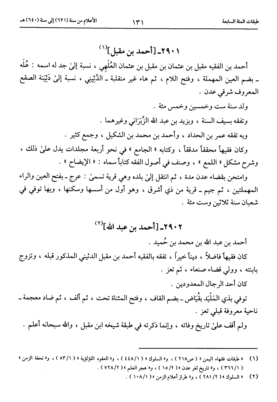 (1) «طبقات فقهاء اليمن» (ص 218)، و «السلوك» (1/ 448)، و «العقود اللؤلؤية» (1/ 53)، و «تحفة الزمن» (1/ 366)، و «تاريخ ثغر عدن» (2/ 15)، و «هجر العلم» (2/ 728).
