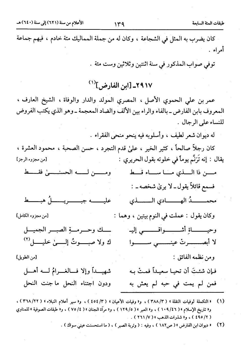 عمر بن علي الحموي الأصل، المصري المولد والدار والوفاة، الشيخ العارف، المعروف بابن الفارض-بالفاء والراء بين الألف والضاد المعجمة-وهو الذي يكتب الفروض للنساء على الرجال.
