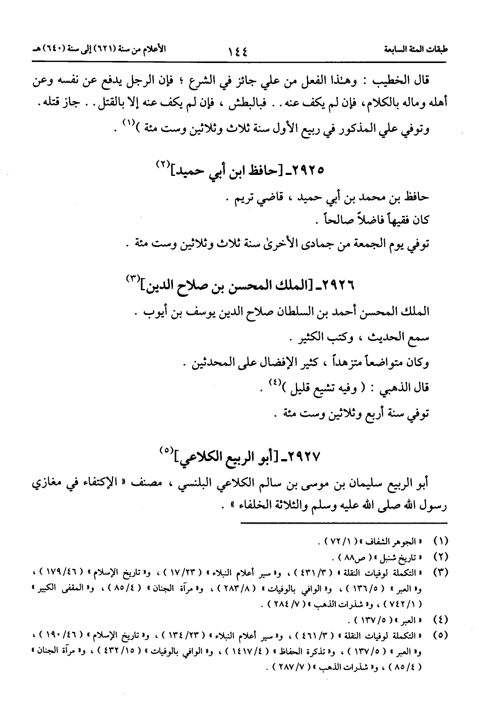 (5) «التكملة لوفيات النقلة» (3/ 461)، و «سير أعلام النبلاء» (23/ 134)، و «تاريخ الإسلام» (46/ 190)، و «العبر» (5/ 137)، و «تذكرة الحفاظ» (4/ 1417)، و «الوافي بالوفيات» (15/ 432)، و «مرآة الجنان» (4/ 85)، و «شذرات الذهب» (7/ 287).