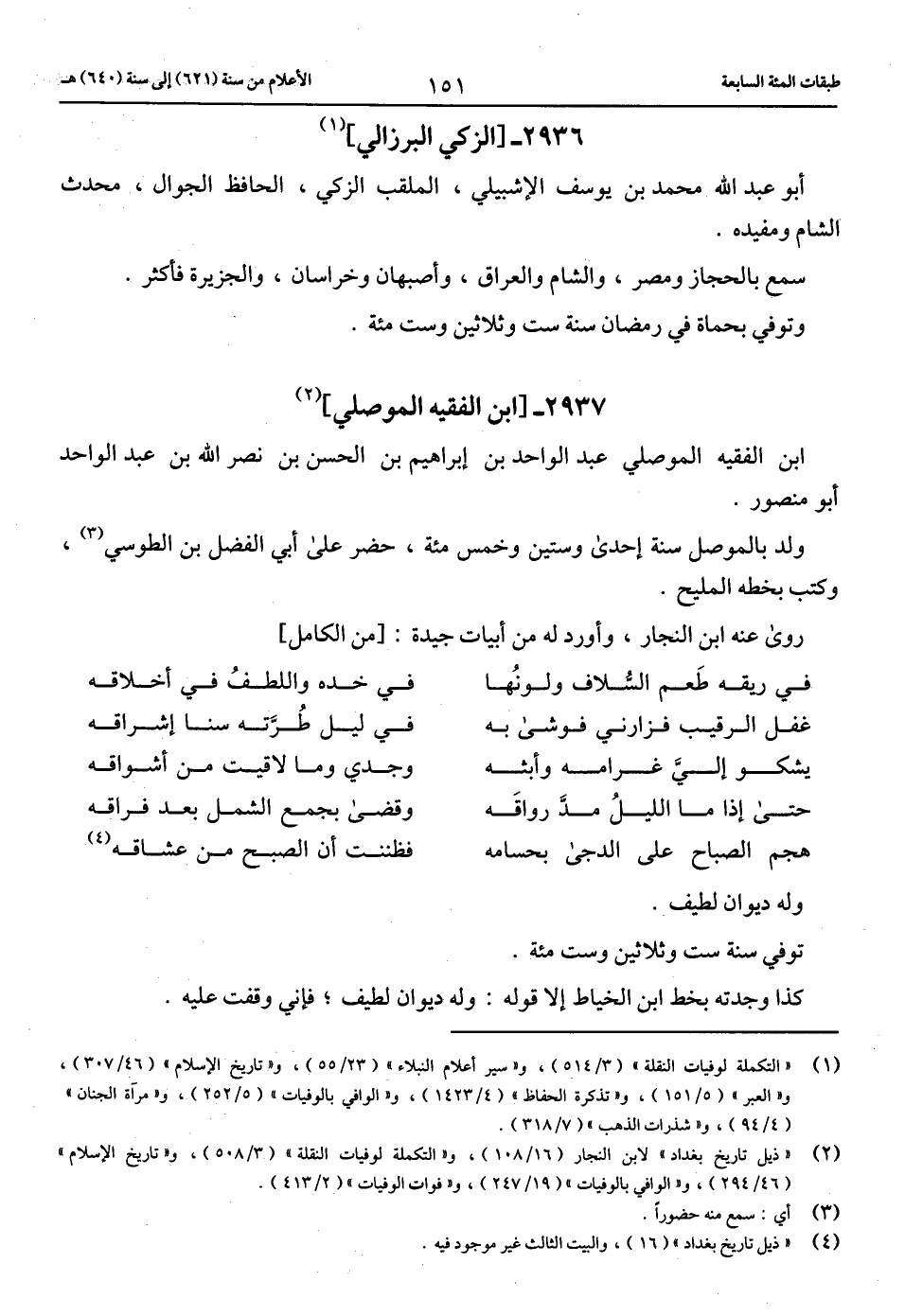 (2) «ذيل تاريخ بغداد» لابن النجار (16/ 108)، و «التكملة لوفيات النقلة» (3/ 508)، و «تاريخ الإسلام» (46/ 294)، و «الوافي بالوفيات» (19/ 247)، و «فوات الوفيات» (2/ 413).