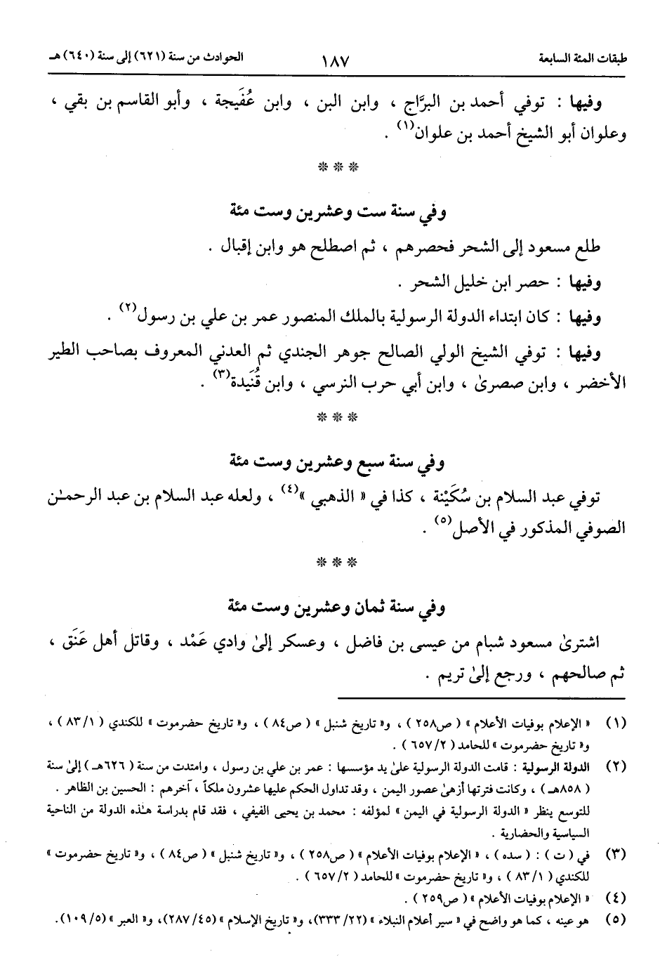(1) «الإعلام بوفيات الأعلام» (ص 258)، و «تاريخ شنبل» (ص 84)، و «تاريخ حضرموت» للكندي (1/ 83)، و «تاريخ حضرموت» للحامد (2/ 657).