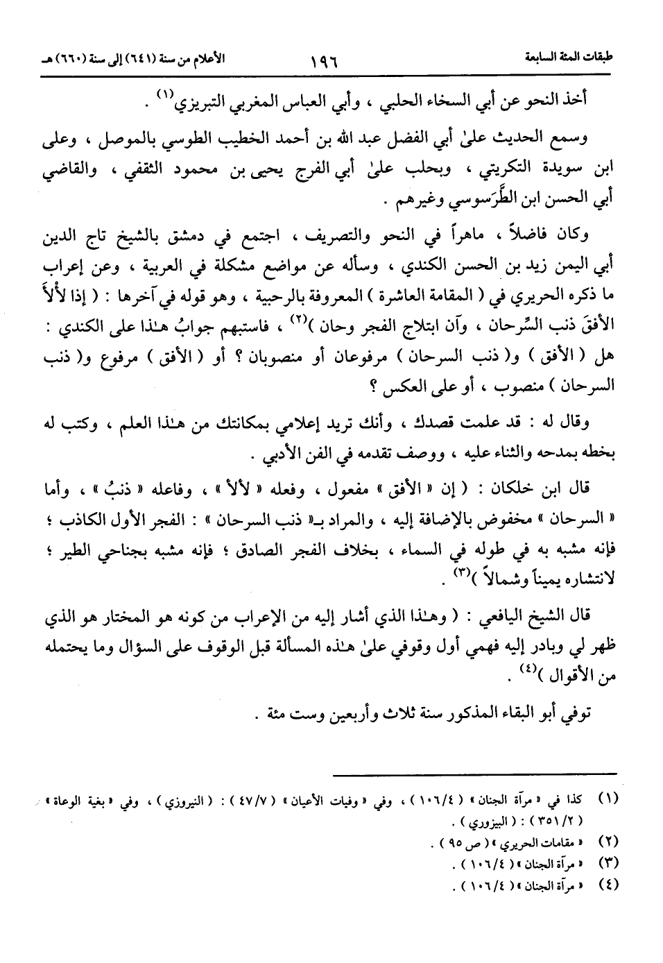 توفي أبو البقاء المذكور سنة ثلاث وأربعين وست مائة.