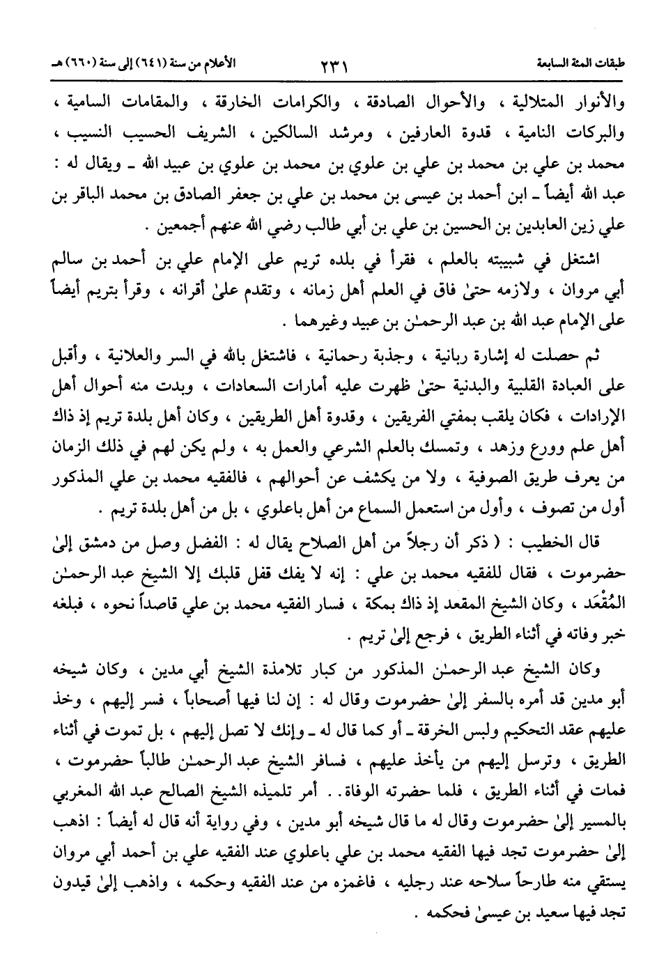 والأنوار المتلالية، والأحوال الصادقة، والكرامات الخارقة، والمقامات السامية، والبركات النامية، قدوة العارفين، ومرشد السالكين، الشريف الحسيب النسيب، محمد بن علي بن محمد بن علي بن علوي بن محمد بن علوي بن عبيد الله-ويقال له: