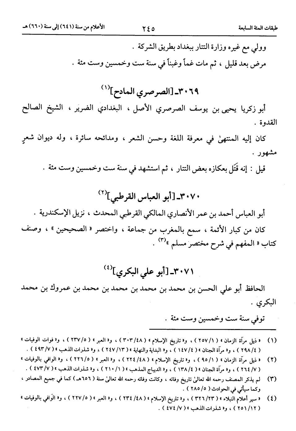 (4) «سير أعلام النبلاء» (23/ 326)، و «تاريخ الإسلام» (48/ 234)، و «العبر» (5/ 227)، و «الوافي بالوفيات» (12/ 251)، و «شذرات الذهب» (7/ 474).