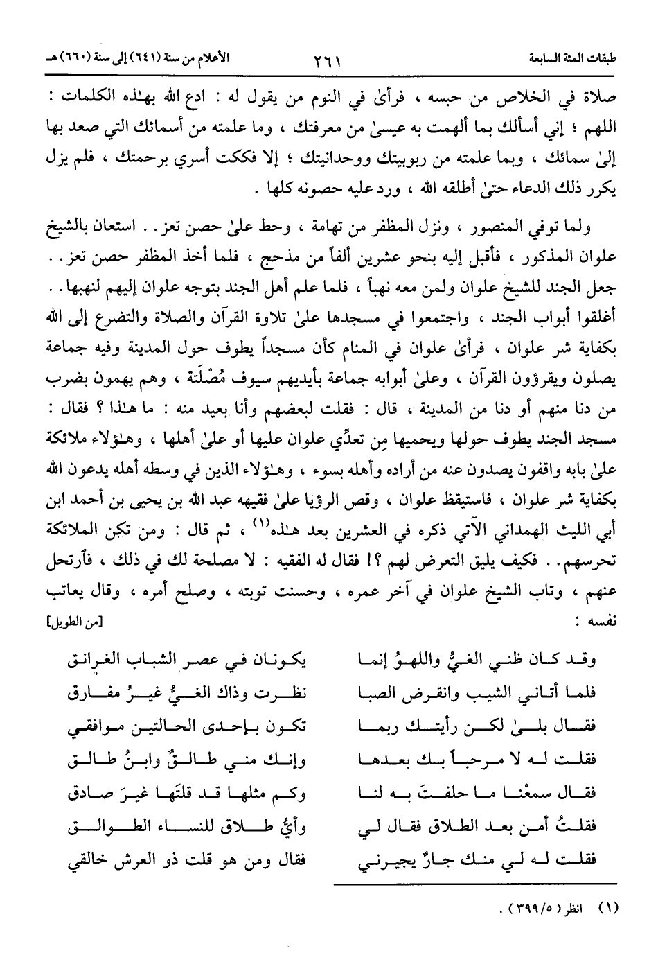 مسجد الجند يطوف حولها ويحميها من تعدّي علوان عليها أو على أهلها، وهؤلاء ملائكة على بابه واقفون يصدون عنه من أراده وأهله بسوء، وهؤلاء الذين في وسطه أهله يدعون الله بكفاية شر علوان، فاستيقظ علوان، وقص الرؤيا على فقيهه عبد الله بن يحيى بن أحمد ابن أبي الليث الهمداني الآتي ذكره في العشرين بعد هذه (1)، ثم قال: ومن تكن الملائكة تحرسهم .. فكيف يليق التعرض لهم؟ ! فقال له الفقيه: لا مصلحة لك في ذلك، فارتحل عنهم، وتاب الشيخ علوان في آخر عمره، وحسنت توبته، وصلح أمره، وقال يعاتب نفسه: [من الطويل]