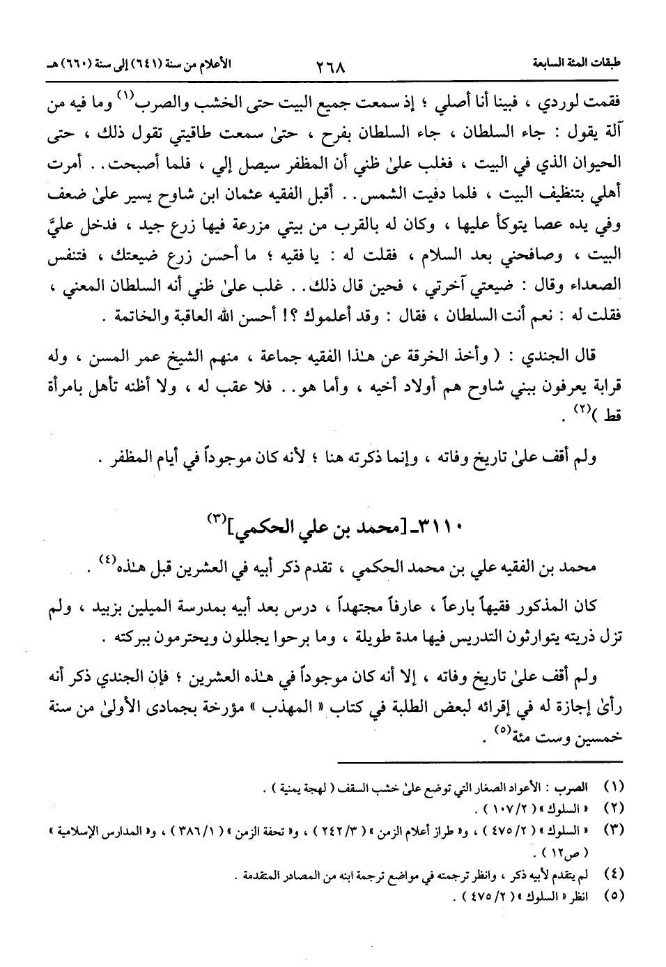 فقمت لوردي، فبينا أنا أصلي؛ إذ سمعت جميع البيت حتى الخشب والصرب (1) وما فيه من آلة يقول: جاء السلطان، جاء السلطان بفرح، حتى سمعت طاقيتي تقول ذلك، حتى الحيوان الذي في البيت، فغلب على ظني أن المظفر سيصل إلي، فلما أصبحت .. أمرت أهلي بتنظيف البيت، فلما دفيت الشمس .. أقبل الفقيه عثمان ابن شاوح يسير على ضعف وفي يده عصا يتوكأ عليها، وكان له بالقرب من بيتي مزرعة فيها زرع جيد، فدخل عليّ البيت، وصافحني بعد السلام، فقلت له: يا فقيه؛ ما أحسن زرع ضيعتك، فتنفس الصعداء وقال: ضيعتي آخرتي، فحين قال ذلك .. غلب على ظني أنه السلطان المعني، فقلت له: نعم أنت السلطان، فقال: وقد أعلموك؟ ! أحسن الله العاقبة والخاتمة.