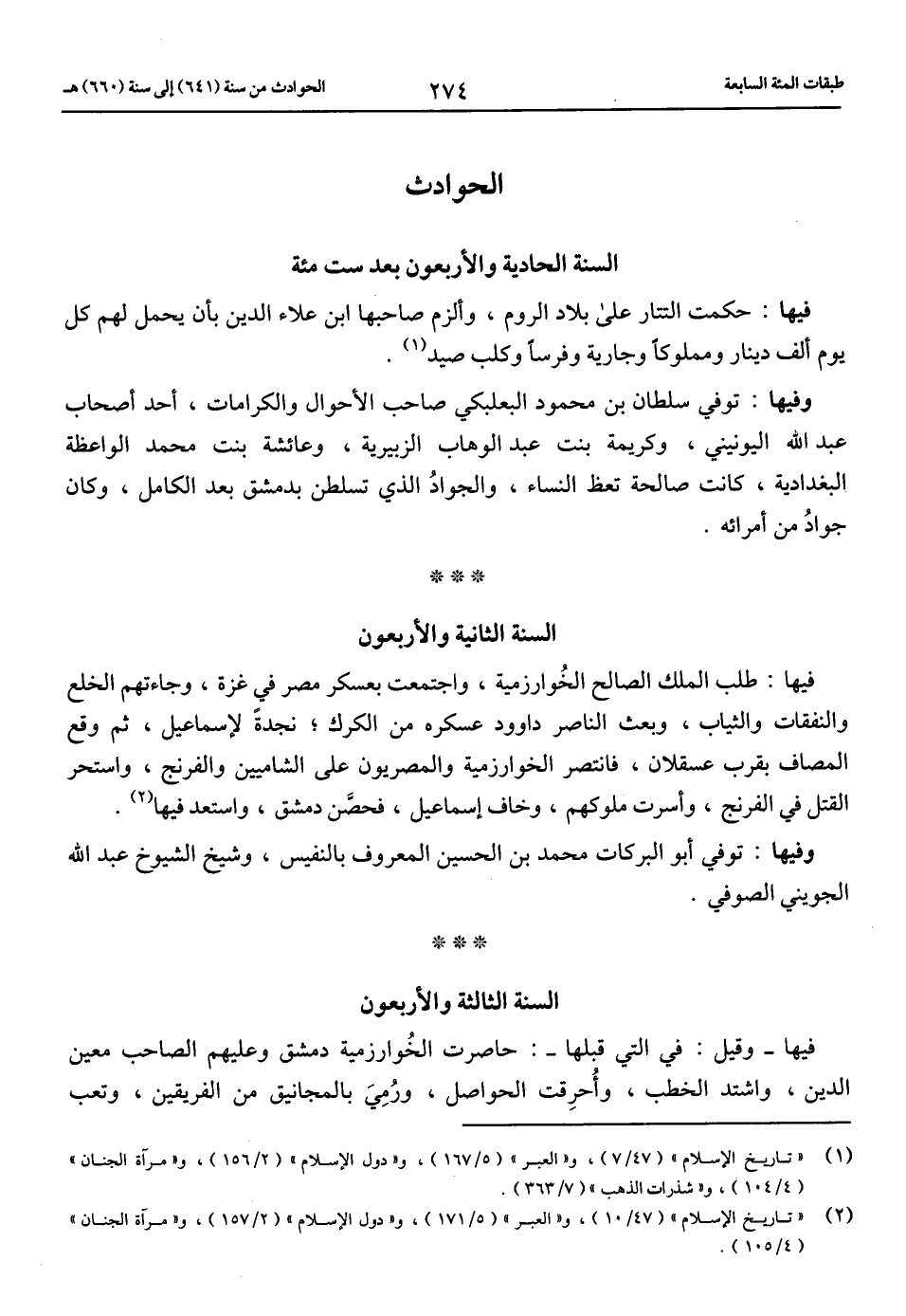 (2) «تاريخ الإسلام» (47/ 10)، و «العبر» (5/ 171)، و «دول الإسلام» (2/ 157)، و «مرآة الجنان» (4/ 105).