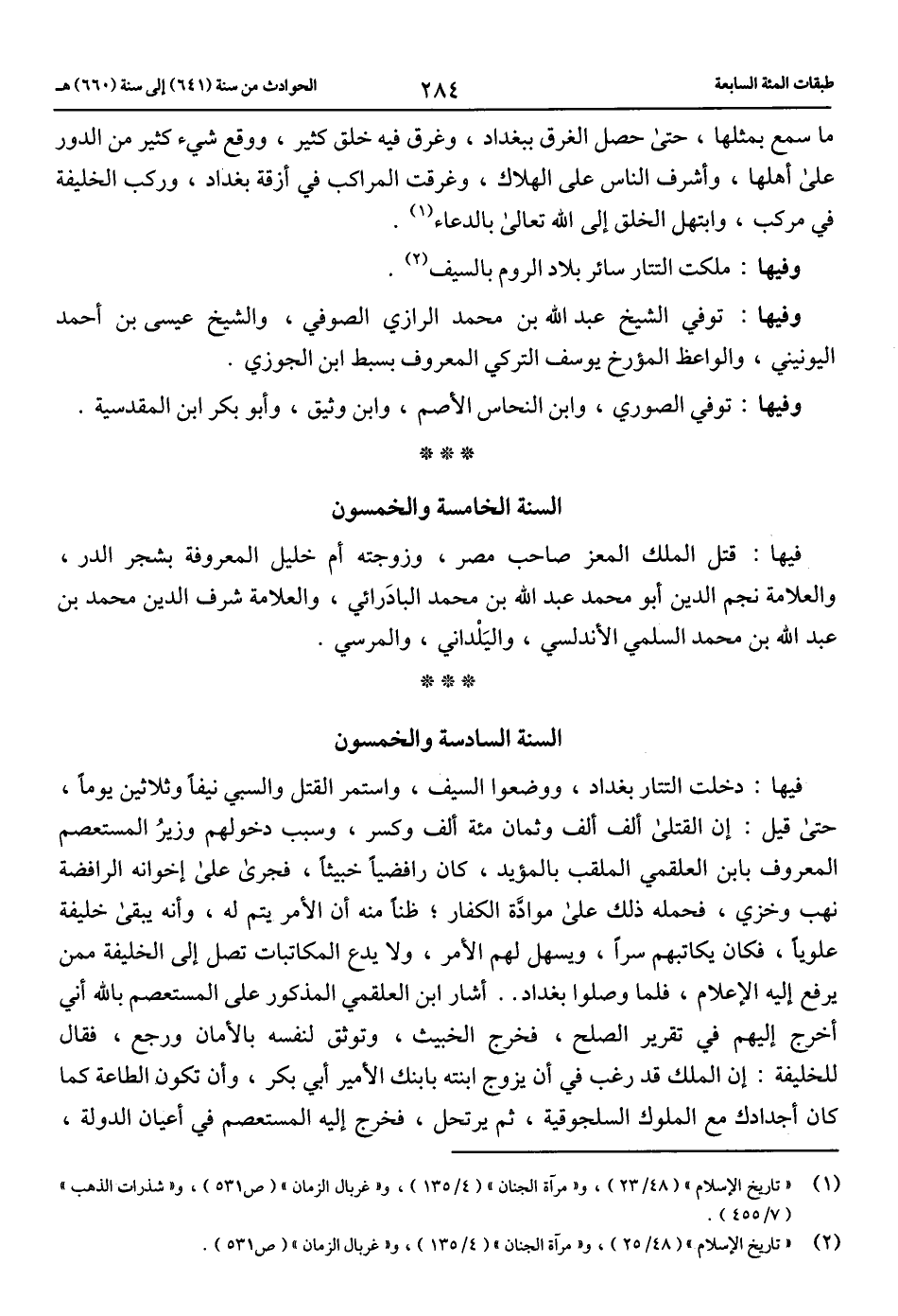 (1) «تاريخ الإسلام» (48/ 23)، و «مرآة الجنان» (4/ 135)، و «غربال الزمان» (ص 531)، و «شذرات الذهب» (7/ 455).