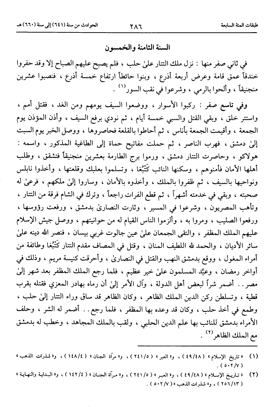 هولاكو، وحاصرت التتار دمشق، ورموا برج الطارمة بعشرين منجنيقا فتشقق، وطلب أهلها الأمان فأمنوهم، وسكنها النائب كتبغا، وتسلموا بعلبك وقلعتها، وأخذوا نابلس ونواحيها بالسيف، ثم ظفروا بالملك، وأخذوه بالأمان، وساروا إلى ملكهم، فرعى له صحبته، وبقي في خدمته أشهرا، ثم قطع الفرات راجعا، وترك في الشام فرقة من التتار، وتأهب المصريون، وشرعوا في المسير، وثارت النصارى بدمشق، ورفعت رءوسها، ورفعوا الصليب، ومروا به، وألزموا الناس القيام له من حوانيتهم، ووصل جيش الإسلام عليهم الملك المظفر، والتقى الجمعان على عين جالوت غربي بيسان، فنصر الله دينه على سائر الأديان، والحمد لله اللطيف المنان، وقتل في المصاف مقدم التتار كتبغا وطائفة من أمراء المغول، ووقع بدمشق النهب والقتل في النصارى، وأحرقت كنيسة مريم، وذلك في أواخر رمضان، وعيّد المسلمون على خير عظيم، فلما رجع الملك المظفر بعد شهر إلى مصر .. أضمر شرا لبعض أهل الدولة، وآل الأمر إلى أن رماه بهادر المعزي فقتله بقرب قطية، وتسلطن ركن الدين الملك الظاهر، وكان الظاهر قد ساق وراء التتار إلى حلب، وطمع في أخذ حلب، وكان قد وعده بها المظفر، فلما رجع .. أضمر له الشر، وحلف الأمراء بدمشق للنائب بها علم الدين الحلبي، ولقب بالملك المجاهد، وخطب له بدمشق مع الملك الظاهر (2).
