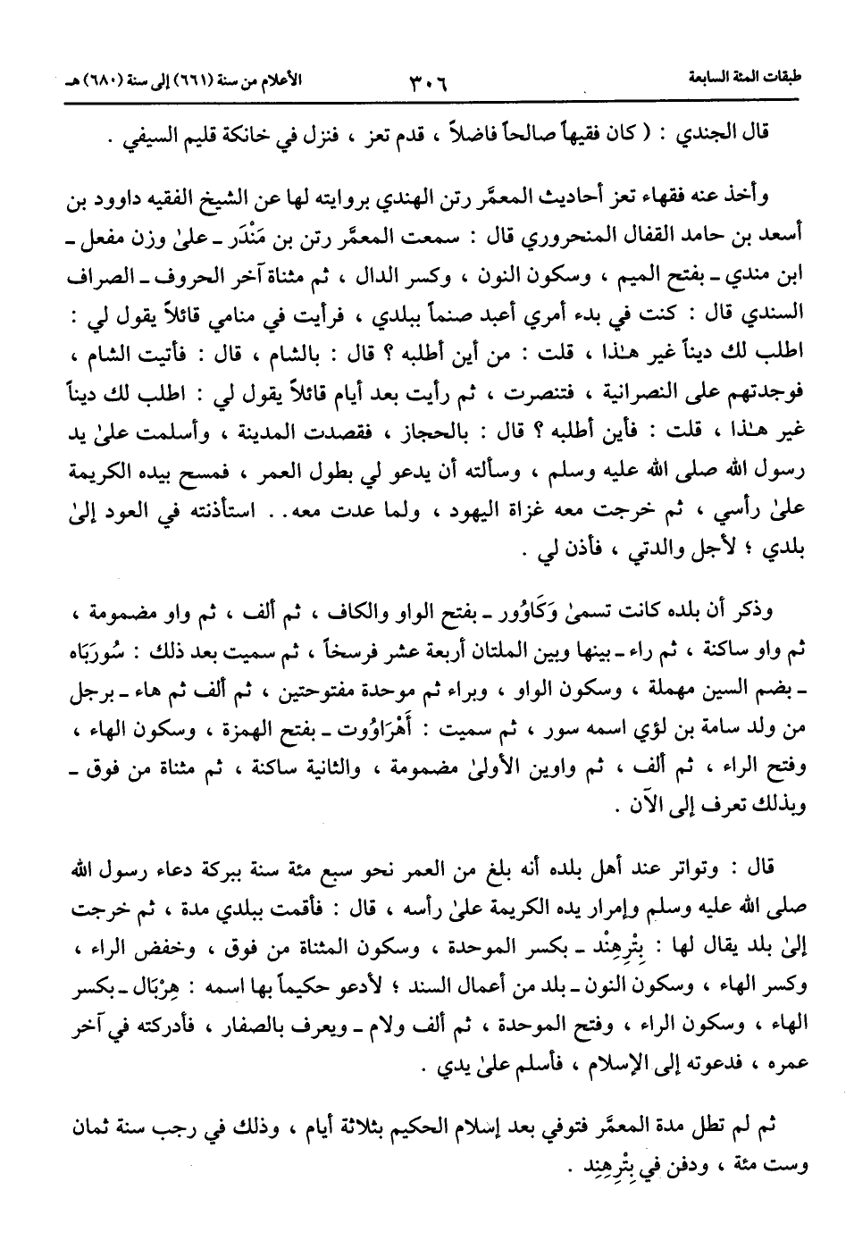 قال: وتواتر عند أهل بلده أنه بلغ من العمر نحو سبع مائة سنة ببركة دعاء رسول الله صلّى الله عليه وسلم وإمرار يده الكريمة على رأسه، قال: فأقمت ببلدي مدة، ثم خرجت إلى بلد يقال لها: بترهند-بكسر الموحدة، وسكون المثناة من فوق، وخفض الراء، وكسر الهاء، وسكون النون-بلد من أعمال السند؛ لأدعو حكيما بها اسمه: هربال-بكسر الهاء، وسكون الراء، وفتح الموحدة، ثم ألف ولام-ويعرف بالصفار، فأدركته في آخر عمره، فدعوته إلى الإسلام، فأسلم على يدي.
