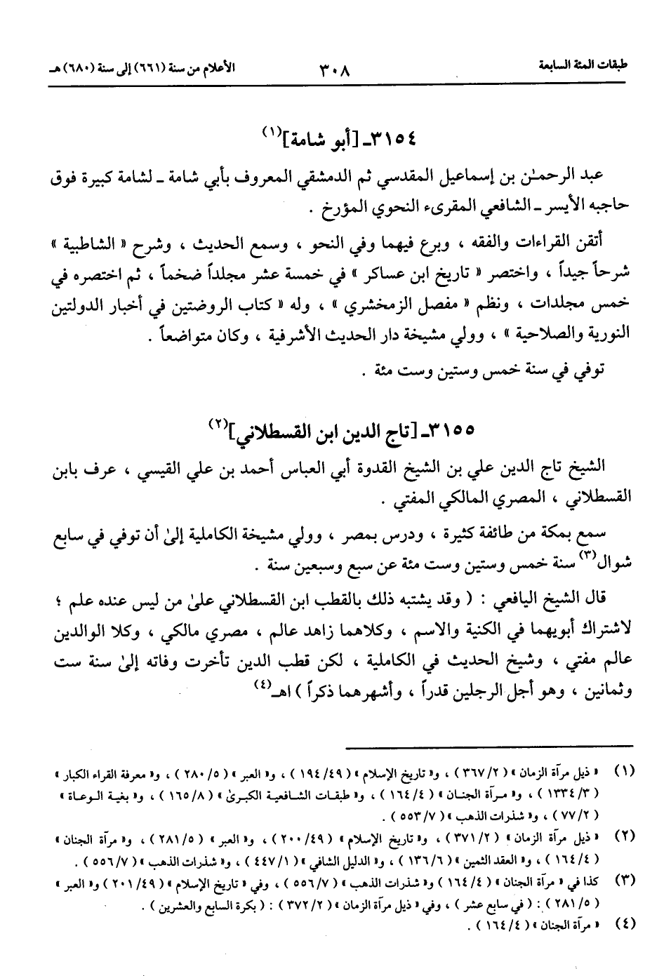 عبد الرحمن بن إسماعيل المقدسي ثم الدمشقي المعروف بأبي شامة-لشامة كبيرة فوق حاجبه الأيسر-الشافعي المقرئ النحوي المؤرخ.