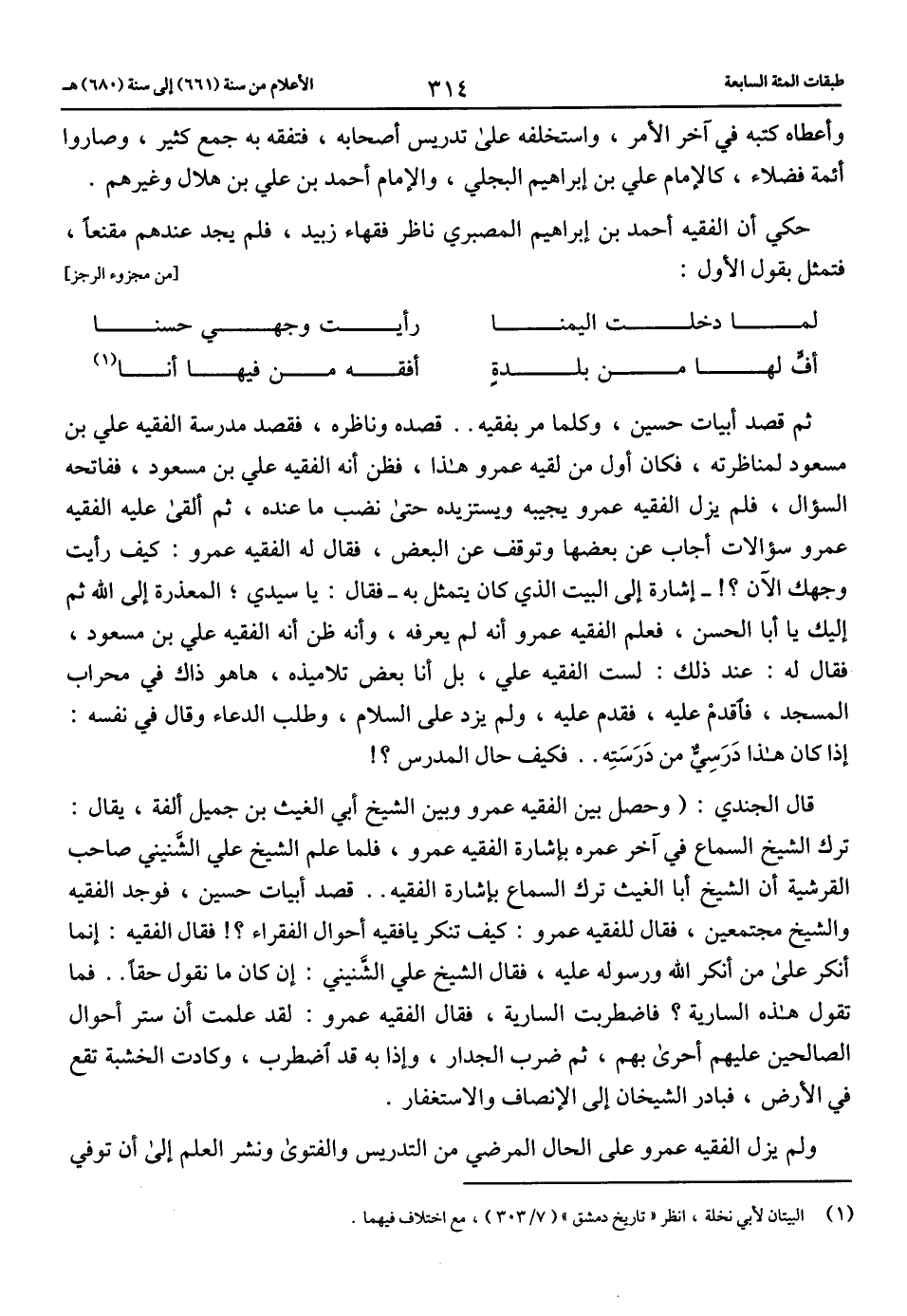 حكي أن الفقيه أحمد بن إبراهيم المصبري ناظر فقهاء زبيد، فلم يجد عندهم مقنعا، فتمثل بقول الأول: [من مجزوء الرجز]