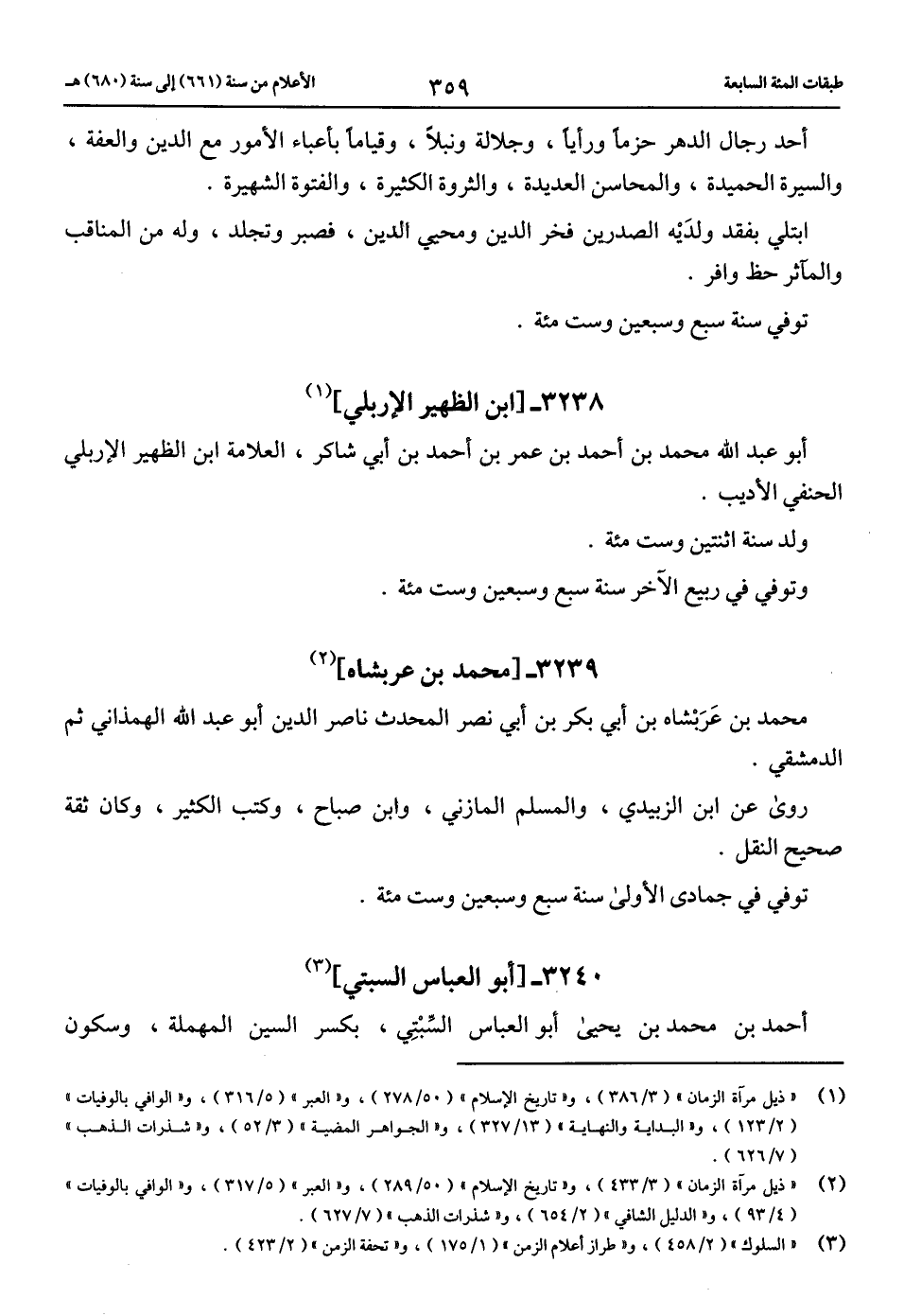 (2) «ذيل مرآة الزمان» (3/ 433)، و «تاريخ الإسلام» (50/ 289)، و «العبر» (5/ 317)، و «الوافي بالوفيات» (4/ 93)، و «الدليل الشافي» (2/ 654)، و «شذرات الذهب» (7/ 627).