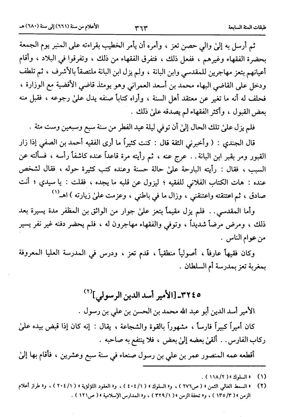 (2) «السمط الغالي الثمن» (ص 276)، و «السلوك» (1/ 404)، و «العقود اللؤلؤية» (1/ 204)، و «طراز أعلام الزمن» (3/ 135)، و «تحفة الزمن» (1/ 329)، و «المدارس الإسلامية» (ص 121).