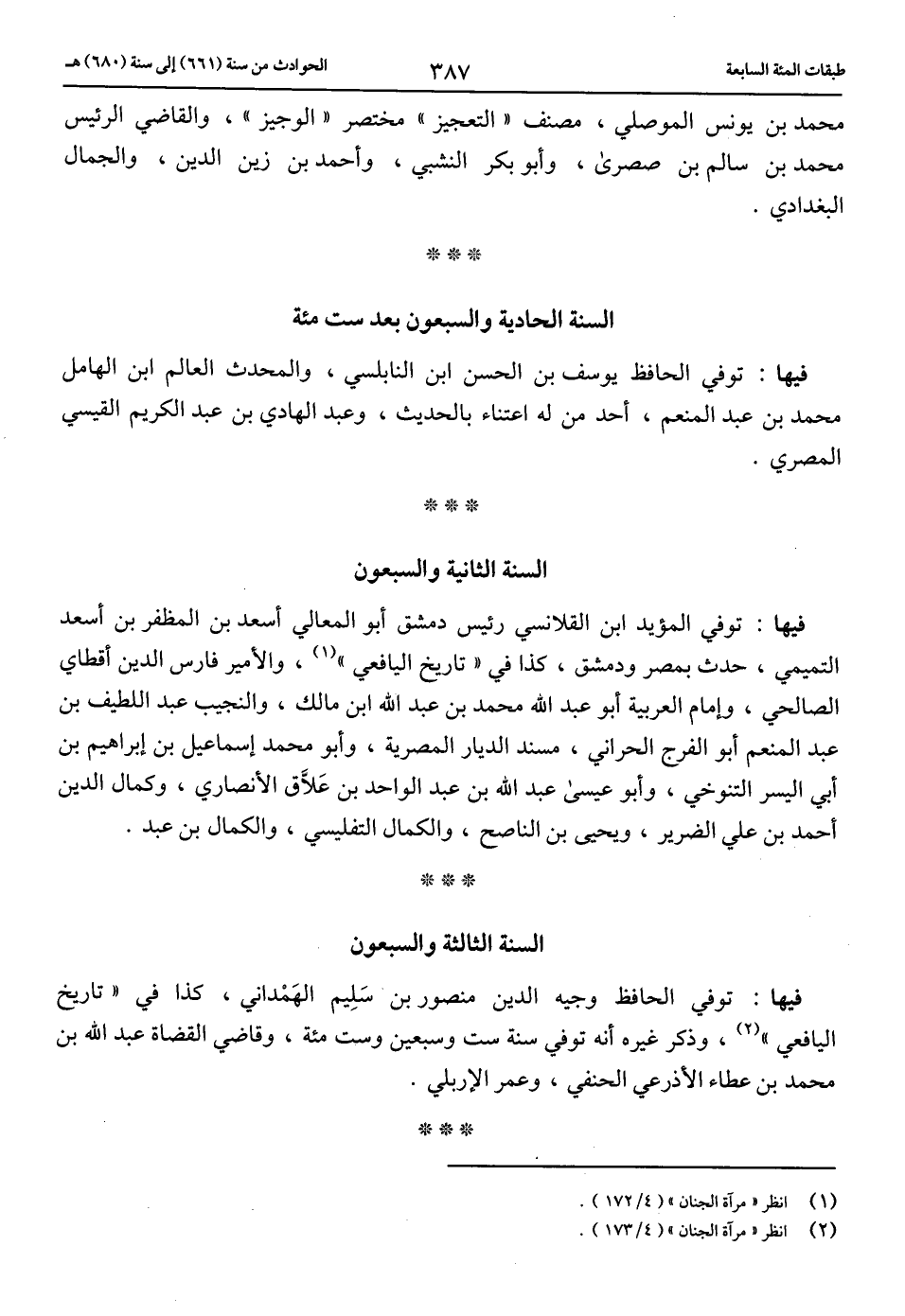فيها: توفي الحافظ وجيه الدين منصور بن سليم الهمداني، كذا في «تاريخ اليافعي» (2)، وذكر غيره أنه توفي سنة ست وسبعين وست مائة، وقاضي القضاة عبد الله بن محمد بن عطاء الأذرعي الحنفي، وعمر الإربلي.
