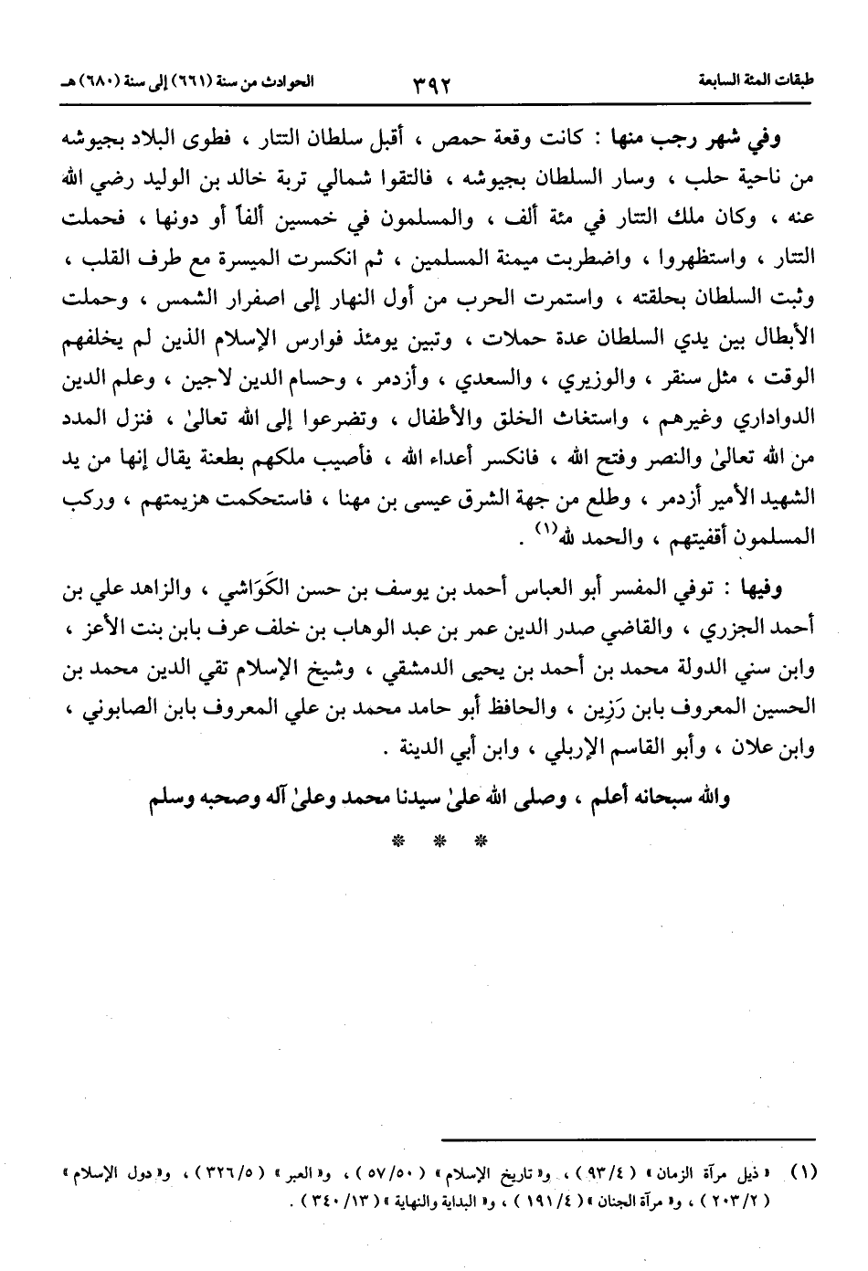 وفي شهر رجب منها: كانت وقعة حمص، أقبل سلطان التتار، فطوى البلاد بجيوشه من ناحية حلب، وسار السلطان بجيوشه، فالتقوا شمالي تربة خالد بن الوليد رضي الله عنه، وكان ملك التتار في مائة ألف، والمسلمون في خمسين ألفا أو دونها، فحملت التتار، واستظهروا، واضطربت ميمنة المسلمين، ثم انكسرت الميسرة مع طرف القلب، وثبت السلطان بحلقته، واستمرت الحرب من أول النهار إلى اصفرار الشمس، وحملت الأبطال بين يدي السلطان عدة حملات، وتبين يومئذ فوارس الإسلام الذين لم يخلفهم الوقت، مثل سنقر، والوزيري، والسعدي، وأزدمر، وحسام الدين لاجين، وعلم الدين الدواداري وغيرهم، واستغاث الخلق والأطفال، وتضرعوا إلى الله تعالى، فنزل المدد من الله تعالى والنصر وفتح الله، فانكسر أعداء الله، فأصيب ملكهم بطعنة يقال إنها من يد الشهيد الأمير أزدمر، وطلع من جهة الشرق عيسى بن مهنا، فاستحكمت هزيمتهم، وركب المسلمون أقفيتهم، والحمد لله (1).