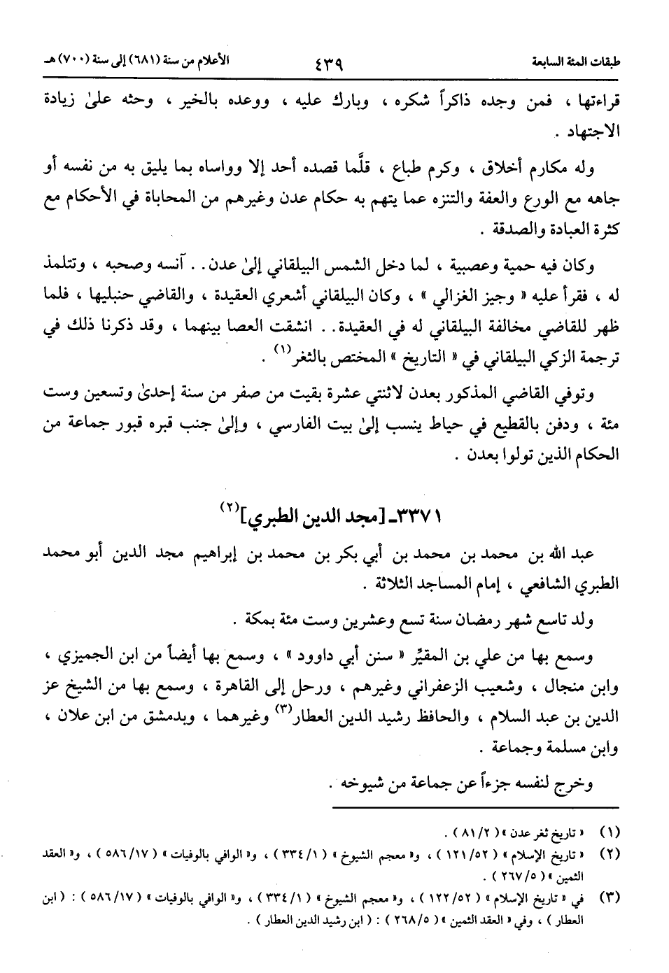 (2) «تاريخ الإسلام» (52/ 121)، و «معجم الشيوخ» (1/ 334)، و «الوافي بالوفيات» (17/ 586)، و «العقد الثمين» (5/ 267).