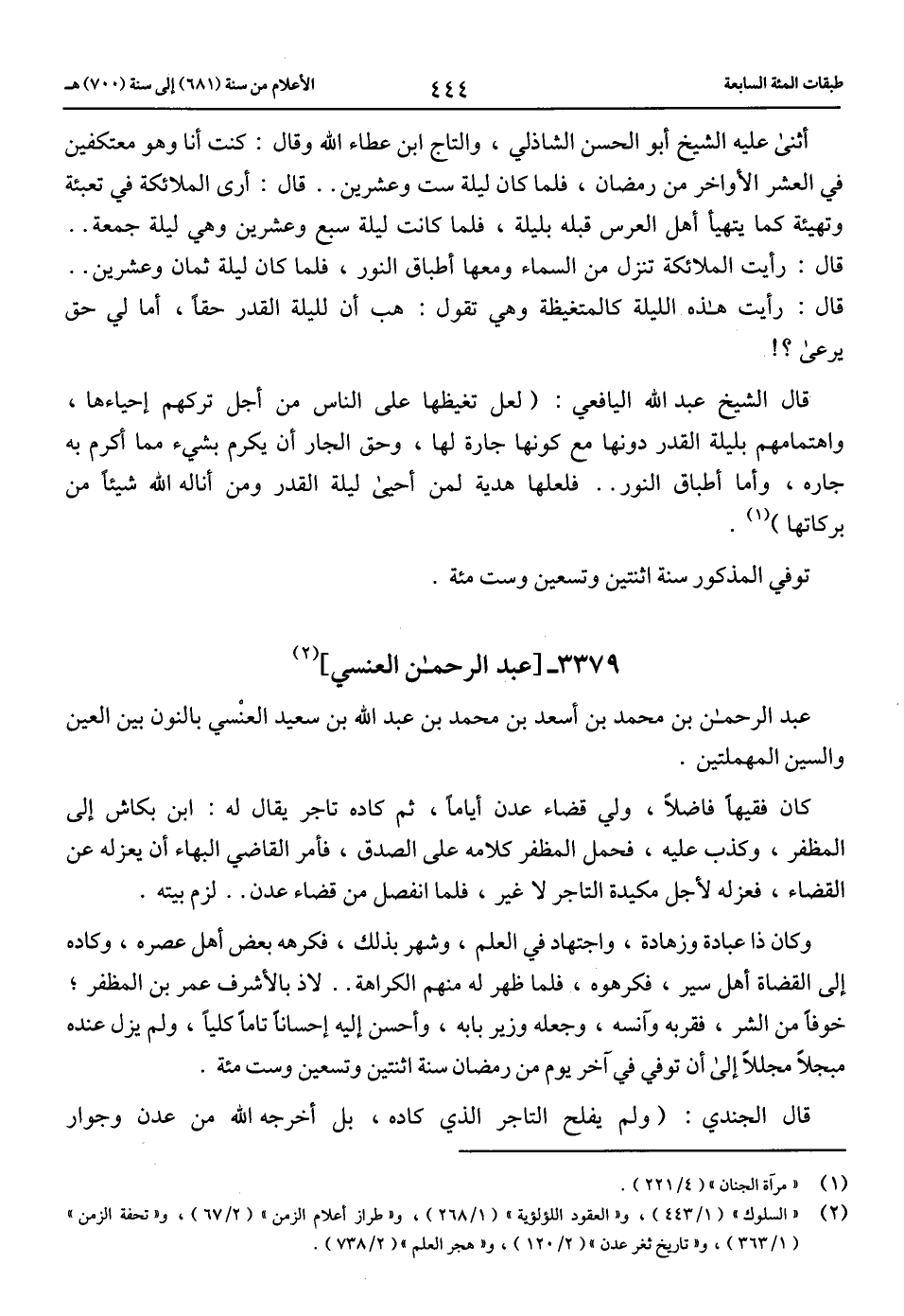 (2) «السلوك» (1/ 443)، و «العقود اللؤلؤية» (1/ 268)، و «طراز أعلام الزمن» (2/ 67)، و «تحفة الزمن» (1/ 363)، و «تاريخ ثغر عدن» (2/ 120)، و «هجر العلم» (2/ 738).