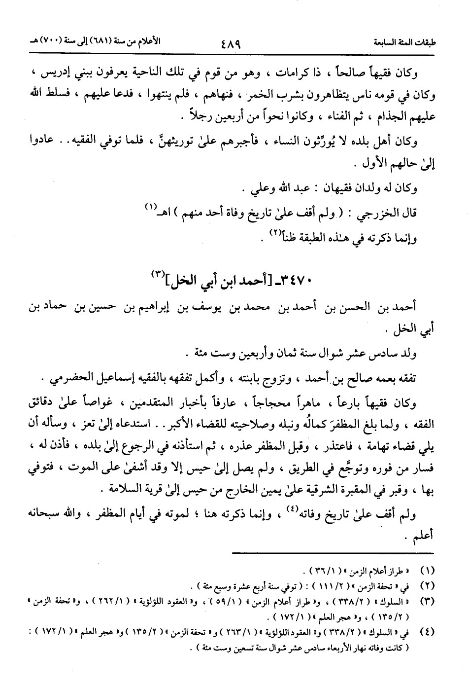 (4) في «السلوك» (2/ 338) و «العقود اللؤلؤية» (1/ 263) و «تحفة الزمن» (2/ 135) و «هجر العلم» (1/ 172): (كانت وفاته نهار الأربعاء سادس عشر شوال سنة تسعين وست مائة).
