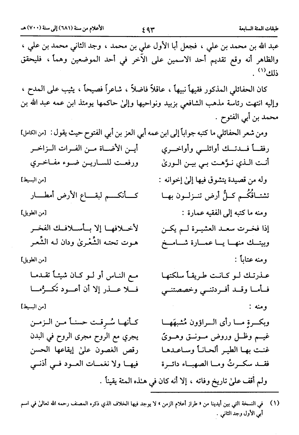 كان الحفائلي المذكور فقيها نبيها، عاقلا فاضلا، شاعرا فصيحا، يثيب على المدح، وإليه انتهت رئاسة مذهب الشافعي بزبيد ونواحيها وإلى حاكمها يومئذ ابن عمه عبد الله بن محمد بن أبي الفتوح.
