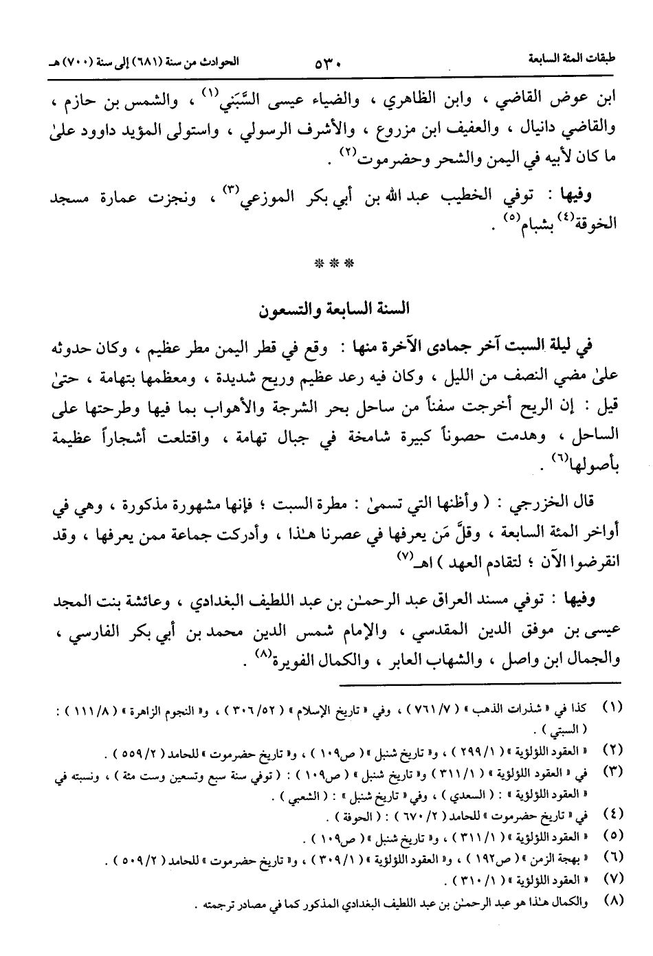 (3) في «العقود اللؤلؤية» (1/ 311) و «تاريخ شنبل» (ص 109): (توفي سنة سبع وتسعين وست مائة)، ونسبته في «العقود اللؤلؤية»: (السعدي)، وفي «تاريخ شنبل»: (الشعبي).