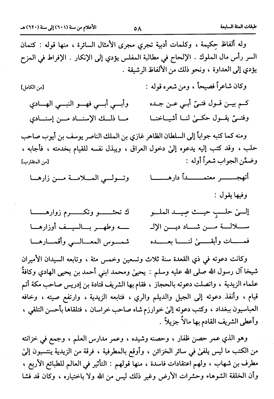 ومنه كما كتبه جوابا إلى السلطان الظاهر غازي بن الملك الناصر يوسف بن أيوب صاحب حلب، وقد كتب إليه يدعوه إلى دخول العراق، ويبذل نفسه للقيام بخدمته، فأجابه، وضمّن الجواب شعرا أوله: [من المتقارب]