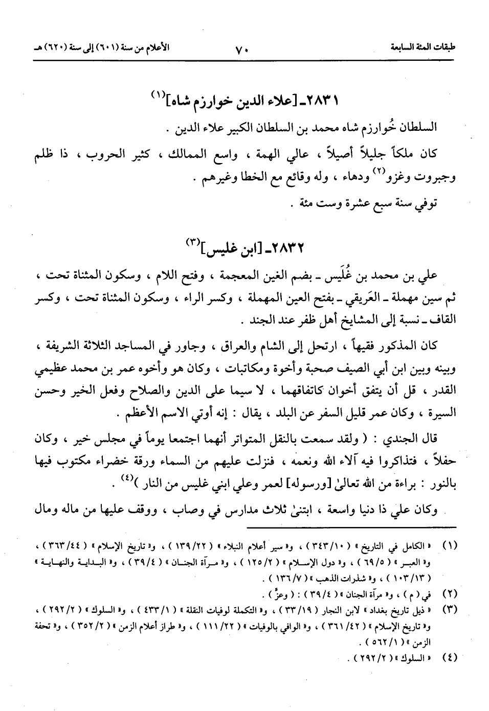 (3) «ذيل تاريخ بغداد» لابن النجار (19/ 33)، و «التكملة لوفيات النقلة» (1/ 433)، و «السلوك» (2/ 292)، و «تاريخ الإسلام» (42/ 361)، و «الوافي بالوفيات» (22/ 111)، و «طراز أعلام الزمن» (2/ 352)، و «تحفة الزمن» (1/ 562).