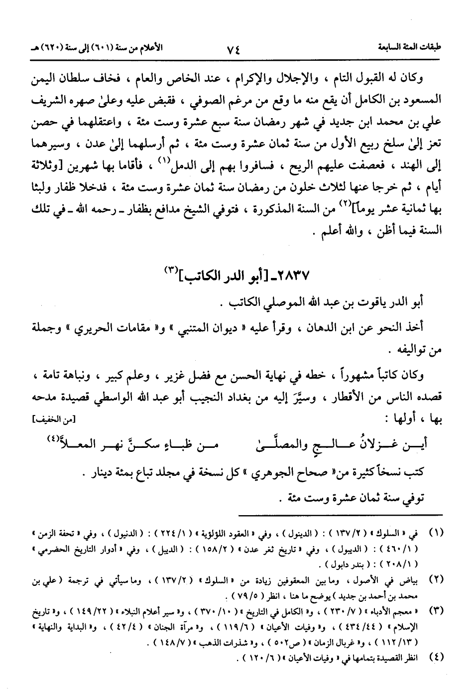 (3) «معجم الأدباء» (7/ 230)، و «الكامل في التاريخ» (10/ 370)، و «سير أعلام النبلاء» (22/ 149)، و «تاريخ الإسلام» (44/ 434)، و «وفيات الأعيان» (6/ 119)، و «مرآة الجنان» (4/ 42)، و «البداية والنهاية» (13/ 112)، و «غربال الزمان» (ص 502)، و «شذرات الذهب» (7/ 148).