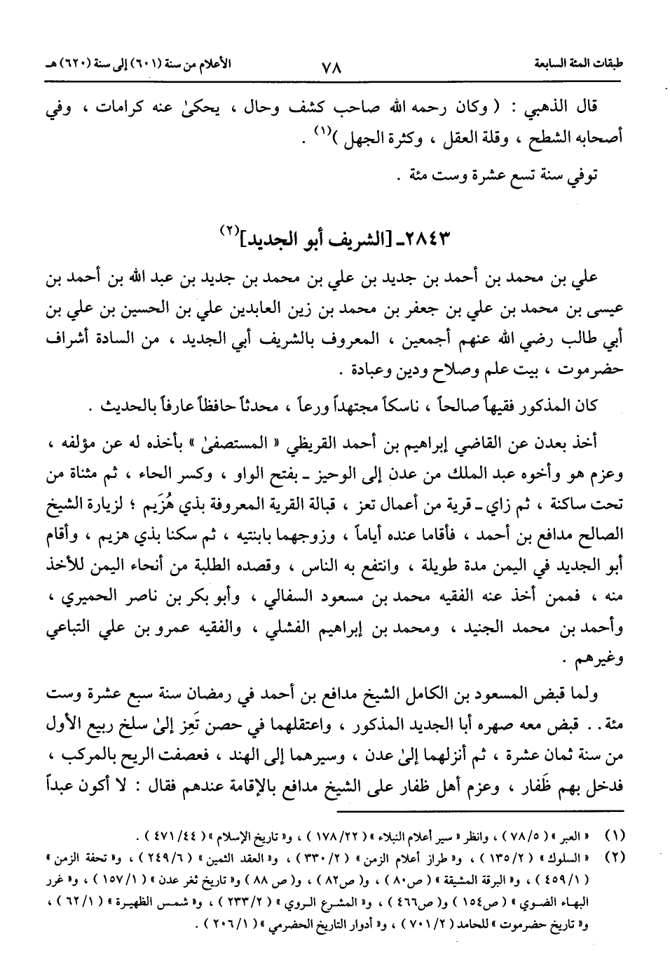 (2) «السلوك» (2/ 135)، و «طراز أعلام الزمن» (2/ 330)، و «العقد الثمين» (6/ 249)، و «تحفة الزمن» (1/ 459)، و «البرقة المشيقة» (ص 80)، و (ص 82)، و (ص 88) و «تاريخ ثغر عدن» (1/ 157)، و «غرر البهاء الضوي» (ص 154) و (ص 466)، و «المشرع الروي» (2/ 233)، و «شمس الظهيرة» (1/ 62)، و «تاريخ حضرموت» للحامد (2/ 701)، و «أدوار التاريخ الحضرمي» (1/ 206).