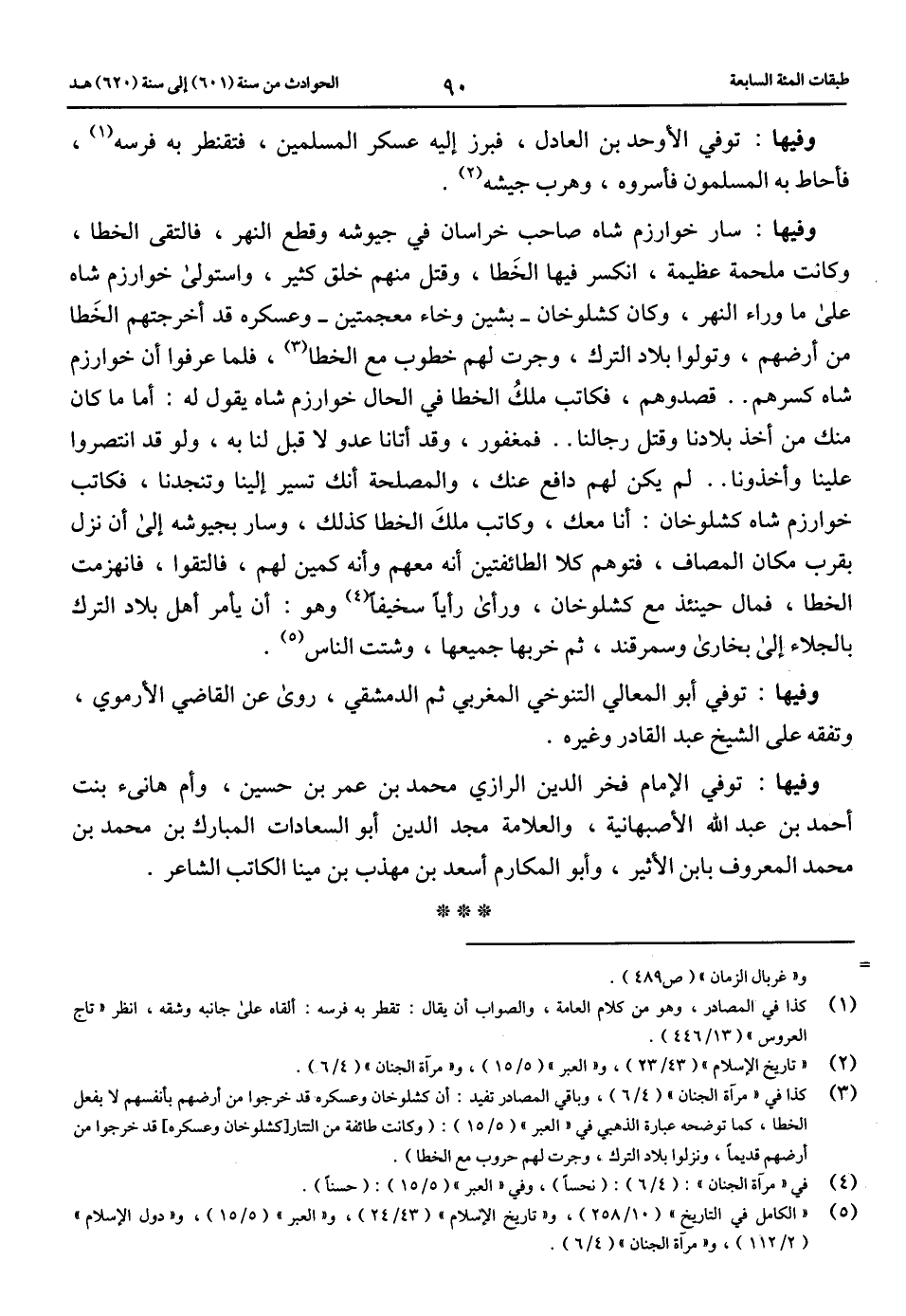 (5) «الكامل في التاريخ» (10/ 258)، و «تاريخ الإسلام» (43/ 24)، و «العبر» (5/ 15)، و «دول الإسلام» (2/ 112)، و «مرآة الجنان» (4/ 6).