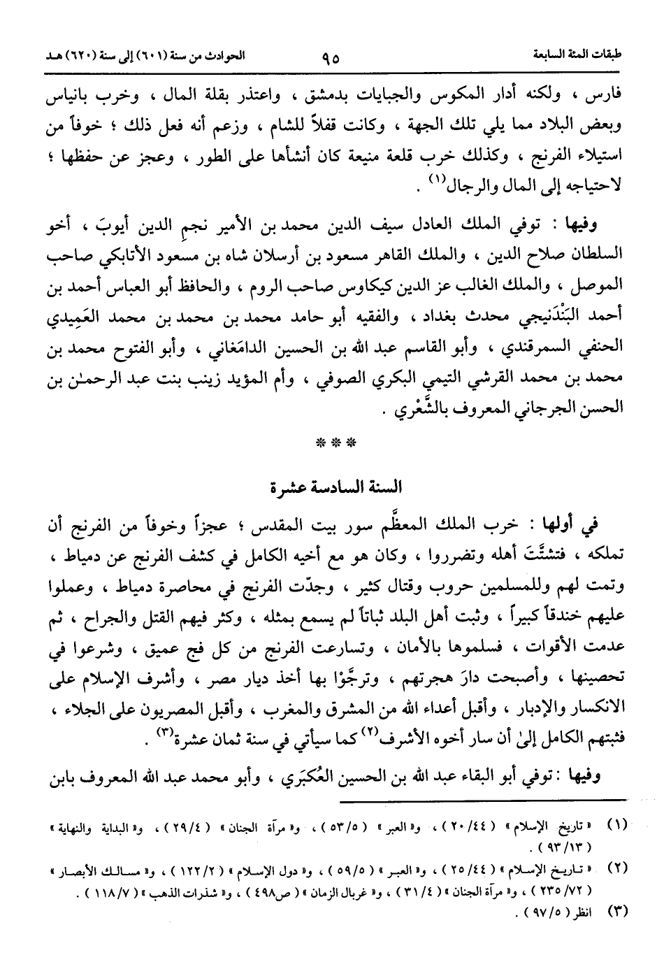 في أولها: خرب الملك المعظّم سور بيت المقدس؛ عجزا وخوفا من الفرنج أن تملكه، فتشتّت أهله وتضرروا، وكان هو مع أخيه الكامل في كشف الفرنج عن دمياط، وتمت لهم وللمسلمين حروب وقتال كثير، وجدّت الفرنج في محاصرة دمياط، وعملوا عليهم خندقا كبيرا، وثبت أهل البلد ثباتا لم يسمع بمثله، وكثر فيهم القتل والجراح، ثم عدمت الأقوات، فسلموها بالأمان، وتسارعت الفرنج من كل فج عميق، وشرعوا في تحصينها، وأصبحت دار هجرتهم، وترجّوا بها أخذ ديار مصر، وأشرف الإسلام على الانكسار والإدبار، وأقبل أعداء الله من المشرق والمغرب، وأقبل المصريون على الجلاء، فثبتهم الكامل إلى أن سار أخوه الأشرف (2) كما سيأتي في سنة ثمان عشرة (3).