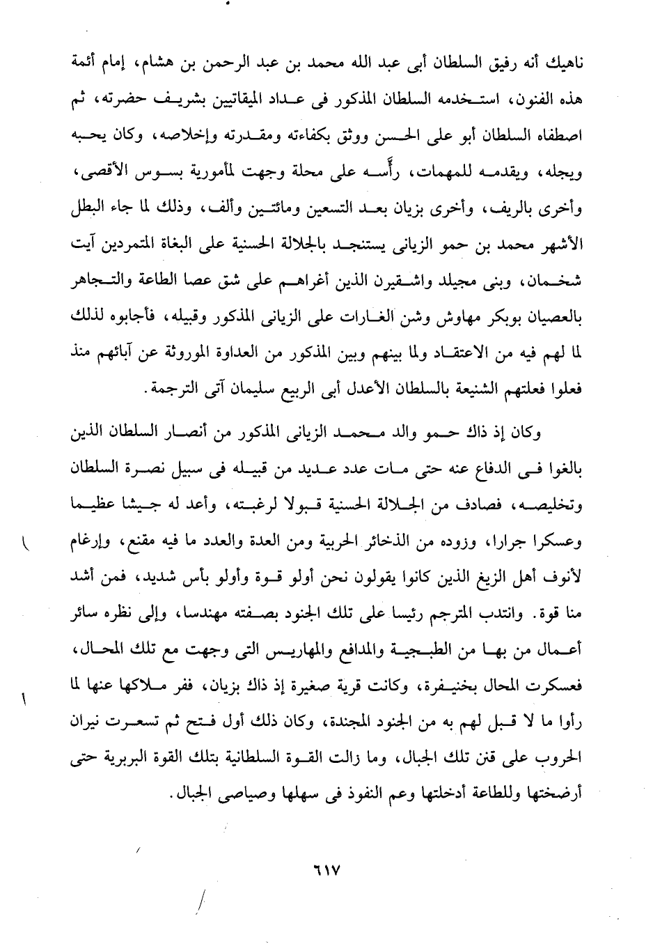 وكان إذ ذاك حمو والد محمَّد الزيانى المذكور من أنصار السلطان الذين بالغوا في الدفاع عنه حتَّى مات عدد عديد من قبيلة في سبيل نصرة السلطان وتخليصه، فصادف من الجلالة الحسنية قبولا لرغبته، وأعد له جيشًا عظيمًا وعسكرا جرارا، وزوده من الذخائر الحربية ومن العدة والعدد ما فيه مقنع، وإرغام لأنوف أهل الزيغ الذين كانوا يقولون نحن أولو قوة وأولو بأس شديد، فمن أشد منا قوة. وانتدب المترجم رئيسا على تلك الجنود بصفته مهندسا، وإلى نظره سائر أعمال من بها من الطبجية والمدافع والمهاريس التي وجهت مع تلك الحال، فعسكرت المحال بخنيفرة، وكانت قرية صغيرة إذ ذاك بزيان، ففر ملاكها عنها لما رأوا ما لا قبل لهم به من الجنود المجندة، وكان ذلك أول فتح ثم تسعرت نيران الحروب على قنن تلك الجبال، وما زالت القوة السلطانية بتلك القوة البربرية حتَّى أرضختها وللطاعة أدخلتها وعم النفوذ في سهلها وصياصى الجبال.