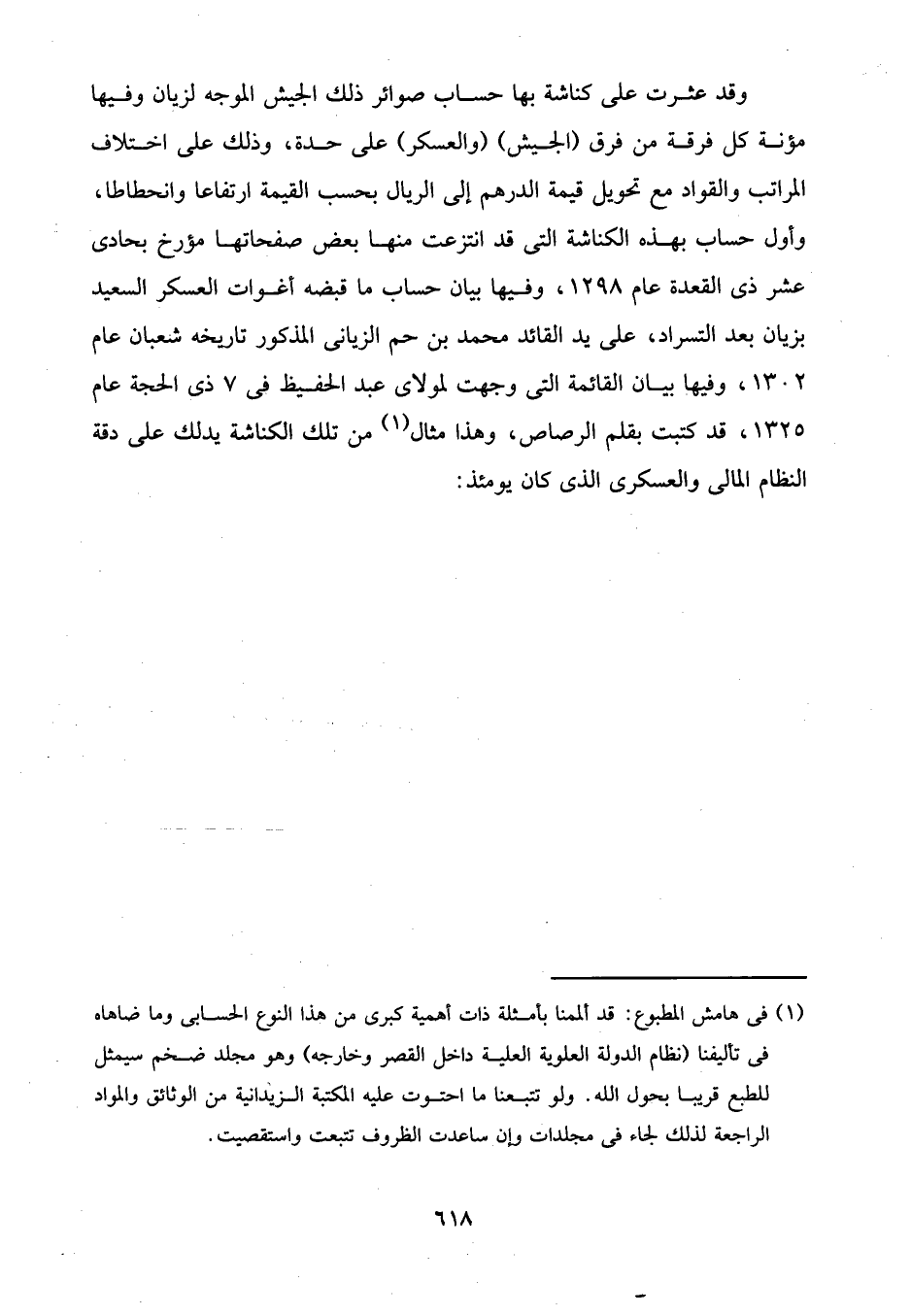 (¬1) في هامش المطبوع: قد ألممنا بأمثلة ذات أهمية كبرى من هذا النوع الحسابى وما ضاهاه في تأليفنا (نظام الدولة العلوية العلية داخل القصر وخارجه) وهو مجلد ضخم سيمثل للطبع قريبا بحول الله. ولو تتبعنا ما احتوت عليه المكتبة الزيذانية من الوثائق والمواد الراجعة لذلك لجاء في مجلدات وإن ساعدت الظروف تتبعت واستقصيت.