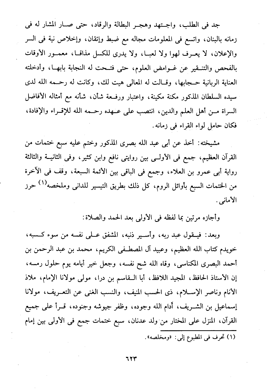 مشيخته: أخذ عن أبي عبد الله بصري المذكور وختم عليه سبع ختمات من القرآن العظيم، جمع في الأولى بين روايتى نافع وابن كثير، وفي الثَّانية والثالثة رواية أبى عمرو بن العلاء، وجمع في الباقي بين الأئمة السبعة، وقف في الآخرة من الختمات السبع بأوائل الروم، كل ذلك بطريق التيسير للدانى وملخصه (¬1) حرز الأمانى.