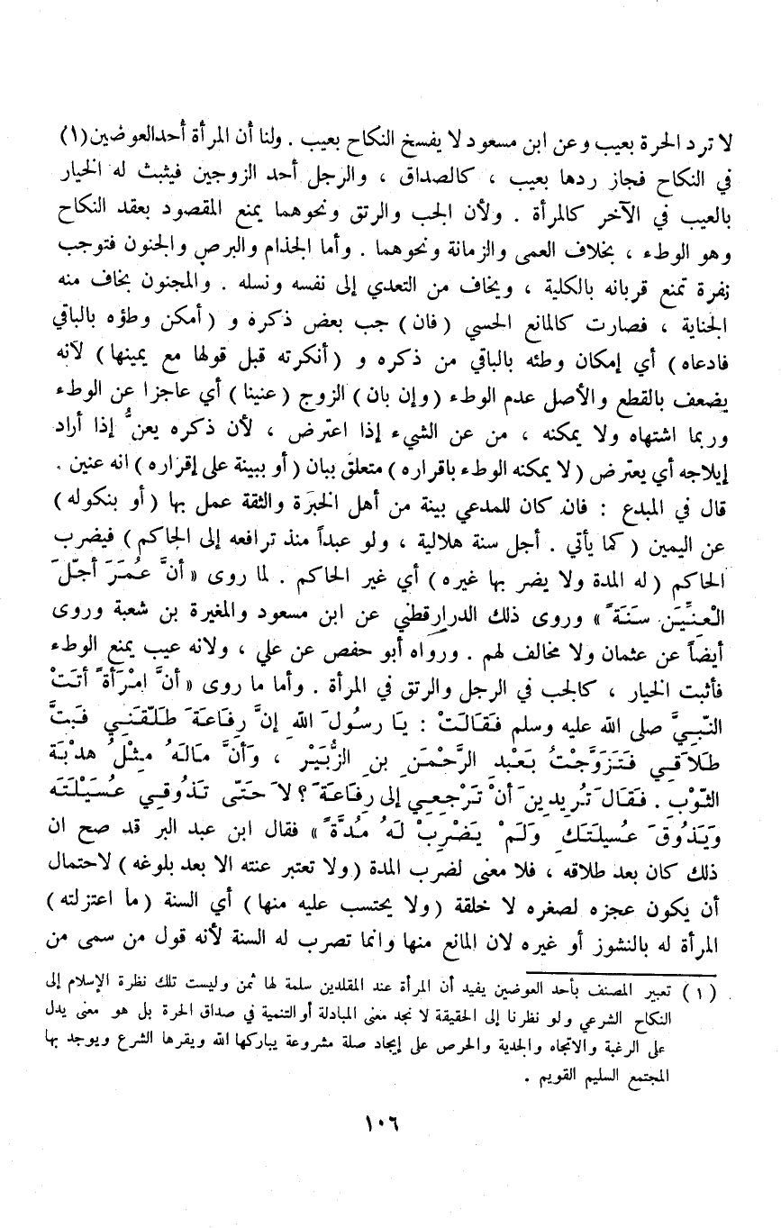 لَا تُرَدُّ الْحُرَّةُ بِعَيْبٍ وَعَنْ ابْنِ مَسْعُودٍ لَا يُفْسَخُ النِّكَاحُ بِعَيْبٍ وَلَنَا أَنَّ الْمَرْأَةَ أَحَدُ الْعِوَضَيْنِ (١) فِي النِّكَاحِ فَجَازَ رَدُّهَا بِعَيْبٍ، كَالصَّدَاقِ، وَالرَّجُلَ أَحَدُ الزَّوْجَيْنِ فَيَثْبُت لَهُ الْخِيَارُ بِالْعَيْبِ فِي الْآخَرِ كَالْمَرْأَةِ وَلِأَنَّ الْجَبَّ وَالرَّتَقَ وَنَحْوَهُمَا يَمْنَعُ الْمَقْصُودَ بِعَقْدِ النِّكَاحِ وَهُوَ الْوَطْءَ بِخِلَافِ الْعَمَى وَالزَّمَانَةِ وَنَحْوِهِمَا وَأَمَّا الْجُذَامُ وَالْبَرَصُ وَالْجُنُونُ فَتُوجِبُ نُفْرَةً تَمْنَعُ قُرْبَانَهُ بِالْكُلِّيَّةِ، وَيُخَافُ مِنْ التَّعَدِّي إلَى نَفْسِهِ وَنَسْلِهِ وَالْمَجْنُونُ يُخَاف مِنْهُ الْجِنَايَةَ، فَصَارَتْ كَالْمَانِعِ الْحِسِّيِّ (فَإِنْ) جُبَّ بَعْضُ ذَكَرِهِ وَ (أَمْكَنَ وَطْؤُهُ بِالْبَاقِي فَادَّعَاهُ) أَيْ إمْكَانَ وَطْئِهِ بِالْبَاقِي مِنْ ذَكَرِهِ وَ (أَنْكَرَتْهُ قُبِلَ قَوْلُهَا مَعَ يَمِينِهَا) لِأَنَّهُ يَضْعُفُ بِالْقَطْعِ وَالْأَصْلُ عَدَمُ الْوَطْءِ.