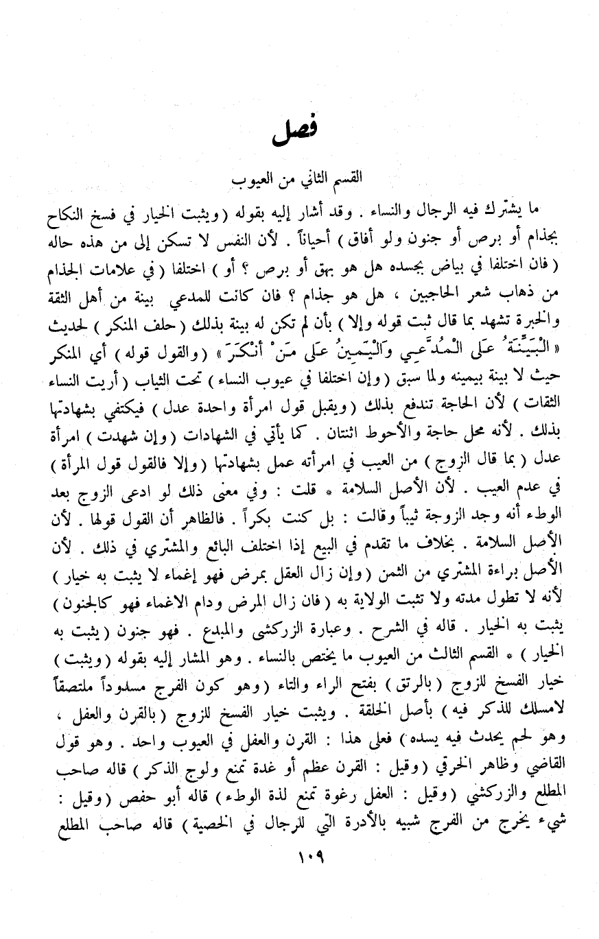 فَصْلٌ الْقِسْمُ الثَّانِي مِنْ الْعُيُوبِ مَا يَشْتَرِكُ فِيهِ الرِّجَالُ وَالنِّسَاءُ وَقَدْ أَشَارَ إلَيْهِ بِقَوْلِهِ (وَيَثْبُتُ الْخِيَارُ فِي فَسْخِ النِّكَاحِ بِجُذَامٍ أَوْ بَرَصٍ أَوْ جُنُونٍ وَلَوْ أَفَاقَ) أَحْيَانًا لِأَنَّ النَّفْسَ لَا تَسْكُنُ إلَى مَنْ هَذِهِ حَالُهُ (فَإِنْ اخْتَلَفَا فِي بَيَاضٍ بِجَسَدِهِ) هَلْ هُوَ بَهَقٌ أَوْ بَرَصٌ؟ (أَوْ) اخْتَلَفَا (فِي عَلَامَاتِ الْجُذَامِ مِنْ ذَهَابِ شَعْرِ الْحَاجِبَيْنِ، هَلْ هُوَ جُذَامٌ؟ فَإِنْ كَانَتْ لِلْمُدَّعِي بَيِّنَةٌ مِنْ أَهْلِ الثِّقَةِ وَالْخِبْرَةِ تَشْهَدُ بِمَا قَالَ ثَبَتَ قَوْلُهُ وَإِلَّا) بِأَنْ لَمْ تَكُنْ لَهُ بَيِّنَةٌ بِذَلِكَ (حَلَفَ الْمُنْكِرُ) لِحَدِيثِ «الْبَيِّنَةُ عَلَى الْمُدَّعِي وَالْيَمِينُ عَلَى مَنْ أَنْكَرَ» (وَالْقَوْلُ قَوْلُهُ) أَيْ الْمُنْكِرِ حَيْثُ لَا بَيِّنَة بِيَمِينِهِ وَلِمَا سَبَقَ.