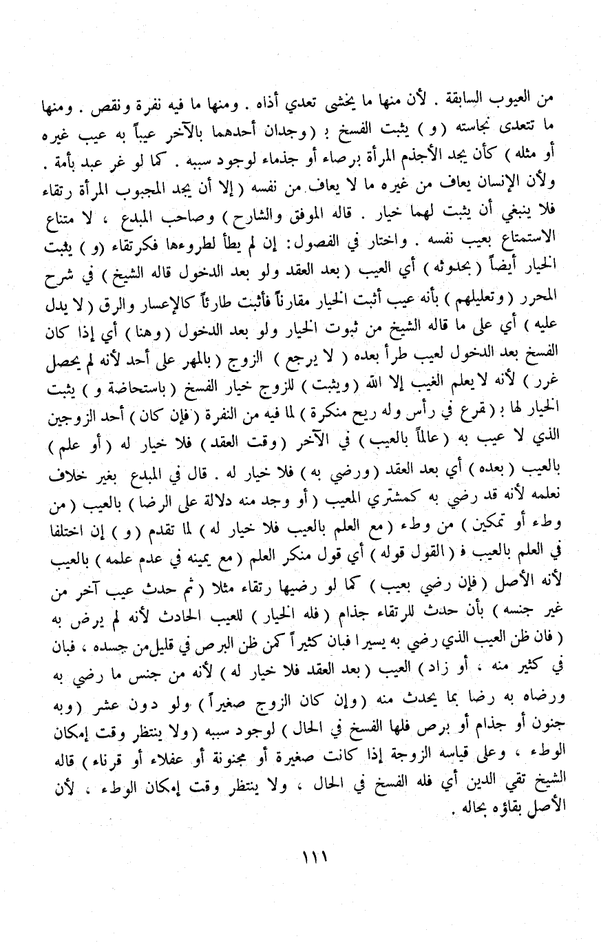(وَلَا يُنْتَظَرُ وَقْتُ إمْكَانِ الْوَطْءِ وَعَلَى قِيَاسِهِ الزَّوْجَةُ إذَا كَانَتْ صَغِيرَةً أَوْ مَجْنُونَةً أَوْ عَفْلَاءَ أَوْ قَرْنَاءَ) قَالَهُ الشَّيْخُ تَقِيُّ الدِّينِ أَيْ فَلَهُ الْفَسْخُ فِي الْحَالِ، وَلَا يَنْتَظِرُ وَقْتَ إمْكَانِ الْوَطْءِ لِأَنَّ الْأَصْلَ بَقَاؤُهُ بِحَالِهِ.