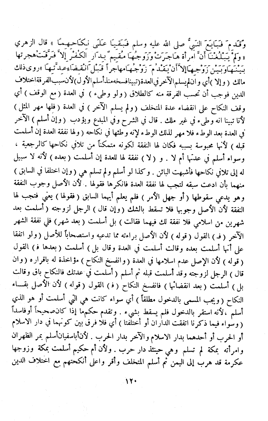 وَقَدِمَ فَبَايَعَ النَّبِيَّ - صَلَّى اللَّهُ عَلَيْهِ وَسَلَّمَ - فَبَقِيَا عَلَى نِكَاحِهِمَا قَالَ الزُّهْرِيُّ وَلَمْ يَبْلُغْنَا أَنَّ امْرَأَةً هَاجَرَتْ وَزَوْجُهَا مُقِيمٌ بِدَارِ الْكُفْرِ إلَّا فَرَّقَتْ هِجْرَتُهَا بَيْنَهَا وَبَيْنَ زَوْجِهَا إلَّا أَنْ يَقْدُمَ زَوْجُهَا مُهَاجِرًا قَبْلَ انْقِضَاءِ عِدَّتِهَا " رَوَى ذَلِكَ مَالِكٌ.